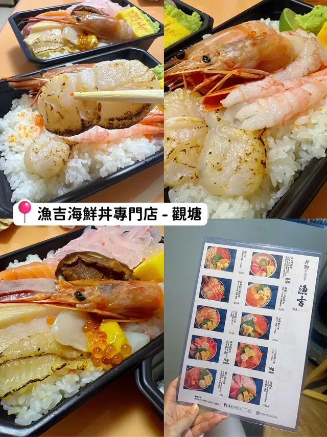 隱世魚生飯 LawrenceJaiJai等級42023-06-18228 瀏覽 關注 放工去到觀塘勁肚餓,都係決定食完飯先至返屋企,搵到一間喺毅力工業中心8樓既魚生飯叫做「漁吉海鮮丼專門店」(唔知算唔算隱世食店?!)不過我朋友話之前喺九龍城食過,其實可能有好多人都知,只係我孤陋寡聞😂。去到間店嘅時候,望到入面有好多外賣盒、紙袋存放着,佢哋應該經常做好多外賣,但係佢哋都有堂食嘅。我哋叫咗兩個飯,一個係北海帆立海老丼,北海帆立丼。北海帆立海老丼 - 有帆立貝、牡丹蝦、赤蝦、甜蝦、少少三文魚子、少少蟹子同埋玉子。材料都幾多,帆立貝係有火炙過,而且可以一次過食到三款唔同嘅蝦👍🏻北海帆立丼 - 有帆立貝、海膽、三文魚子同埋玉子。咁啱海膽賣晒!佢問我想轉咩刺身代替海膽,我揀咗油甘魚。現場仲會有一個自助茶水吧,無限添飲。(溫馨提示:如果你係堂食,又想飲其他飲品的話,可以買咗嘢飲先去食飯。)…查看更多以上食評乃用戶個人意見 , 並不代表OpenRice之觀點。讚好分享隱世魚生飯 漁吉海鮮丼專門店 https://s.openrice.com/QrbT06oyb00檢舉 張貼 評分4味道4環境4服務4衛生4抵食用餐途徑堂食
