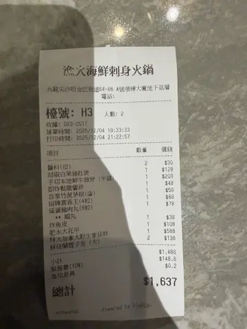 尖沙咀漁火,新開火鍋熱店環境靚食材正!隱身火鍋,湯底新鮮暖胃,海鮮牛肉水準高~湯底開胃(豬肚胡椒暖身,飲一碗又一碗解饞):- 胡椒豬肚湯:豬肚脆嫩湯頭辣暖,胃暖笠笠未食主菜已滿足!刺身海鮮(新鮮彈牙海洋味爆,厚切鮮甜):- 象拔蚌刺身(一條):脆爽無比甜美,Q彈入口即化海味濃。- 蘇格蘭蟶子皇(兩隻):大條肉質細緻彈牙肥厚,極鮮不腥奢華。- 肥水大花甲:巨型肉厚咬落爆鹹水汁,海洋鮮香juicy。滑肉丸子(自家製嫩滑有層次,入味必點):- 墨魚拼蝦滑:Q彈爽口水準高,蝦墨魚粒提鮮不柴。- 漁火特色四色丸(豬肉/蝦肉/牛肉/墨魚黃金丸):鹹蛋黃款最愛綿密香濃,彈牙多汁解饞。- 招牌雲吞王:拳頭大粒滿肉大蝦,煮熟juicy鮮甜暖心。牛肉主打(極品柔軟牛香撲鼻):- 極品騸牯牛:閹牛脂肪多肉嫩有味,入口即化不柴高質小食解饞(脆香惹味,配湯一流):- 即炸酥脆響鈴$48:超大熱辣辣新鮮炸,厚身硬脆有別包裝貨飲品收尾(自家製清新降火):- 自家竹蔗茅根:微甜原汁無冰,爽凍滋潤平衡辣味完美。…查看更多