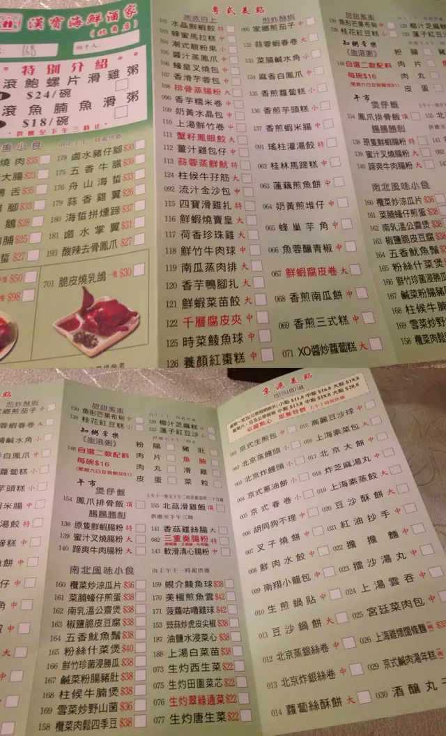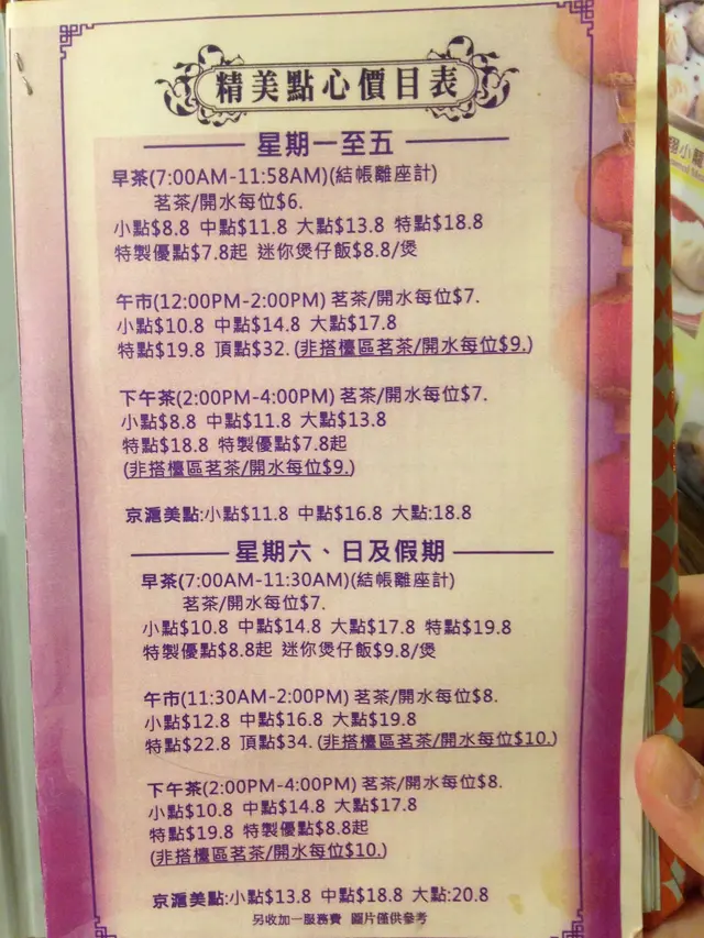 今天早上我要帶爸爸來這裏和他的好朋友們飲早茶,每月一次,而我今次約了一個同業退休的好友和我喺爸爸張枱附近撐枱腳,因為這位好朋友住在香港島,佢想食其他酒樓食不到的點心,所以我們點了:1. 涼瓜煎魚餅(中點)- $17.8,朋友嫌涼瓜苦左啲,但係因為我鍾意食涼瓜,啲涼瓜粒做得夠稔才混魚肉去煎,好好食!只係多油咗啲,用紙巾吸去多餘的油就可以了。2. 香菇雞絲腸粉$14.8 - 好好味!我覺得入面嗰啲不是香菇,很多都是蟲草花,那種組合出嚟的味道好好味!腸粉的皮質感和味道都正!3. 紫薯奶黃球(大點)- $20.8,這個是炸的,朋友認為這個是今日所叫的所有點心入面最好味的,沒有多餘的油。4. 薑蔥牛肉角 (中點) - $17.8,這個是懷舊點心,做到小時候的美味,食落好開心!朋友爭住埋單,$100,點左水仙茶,下次要話明要小茶葉先!這些獨有美味的點心不可以和酒店的點心相比,因為酒店絕對沒有這類型的點心,如果唔想成日食嚟食去都係果啲,呢四款是必食的!仲有一個發現就是酒樓應該換咗新的洗碗機,啲碗碟洗得好乾淨!值得一讚!…查看更多
