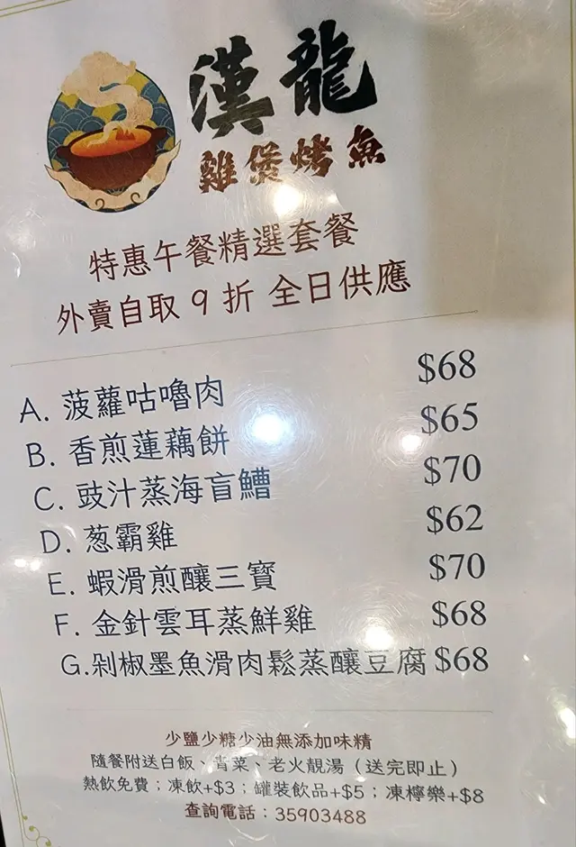 漢龍雞煲烤魚 (沙田) 網址: https://s.openrice.com/QrbS0oNaD00 地址: 香港沙田石門安群街1號京瑞廣場2期2樓225號舖 電話: +852 35903488