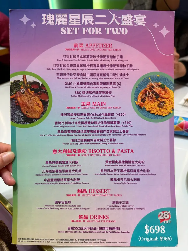年初七人日那天,我們去了一間很有特色的餐廳慶祝。一打開門的一刻就如進入了一個夢幻的萬花筒世界之中,感覺很不現實,整間餐廳色彩繽紛,所有佈置都令人有一種愉快和輕鬆的感覺。糖果的色系亦令人有一種甜蜜幸福的氛圍。餐廳提供的餐具、食物的擺相也是五顏六色,色彩斑斕,每張枱面更有一個萬花筒提供給食客欣賞。當日我們點選了一個⭐️「瑰麗星辰二人盛宴」 ⭐️🔹前菜🌟西班牙伊比亞辣肉腸白酒忌廉煮藍青口配牛油多士最欣賞牛油厚多士切成圓形,焗得非常香脆,配上忌廉汁非常可口。不過藍青口就偏向細小,如果選用較大的青口會更好。🔹主菜🌟 香烤比利時杜洛克橄欖豬斧頭扒伴脆甜蕃薯條豬斧頭扒煎得恰到好處,只要你跟着肉的紋路切成薄片,再加上他的特製醬汁,味道相當不錯。而甜薯條亦非常香脆可口。🌟黑魚籽麵包蟹意大利飯賣相相當不俗,亦很高貴的感覺,但是與我期望的有少許出入,蟹膏的味道都算濃郁,但如果有蟹肉加入會更加出色。🔹甜品🌟黑鏡子之謎(Tartufo Caffè with Cream, Honeycomb & Meringue)這個意大利傳統的甜品外型非常有型格,朱古力脆片很出色,不過小朋友未必喜歡帶有咖啡的味道。🔹飲品🌟OMG 5C(包括車厘茄及山楂/香橙及白桃/ 菠蘿及茘枝/青提子及青蘋果/火龍果及紅桑子)這個飲品非常特別,亦是很受歡迎的,原因是打卡一流,一個飲品包含五種顏色和不同的味道,十分有驚喜。🌟青蘋果青檸檸檬梳打反而這個青蘋果青檸檸檬梳打略嫌非常淡味,沒有什麼特色。由於三人的關係有最低消費的關係,我們另加了一個甜品🌟FIKAFIKA (Milk Mochi with Red Bean Paste & Matcha Crumble, Meringue,Tofu Mousse)這個甜品造型非常趣緻,不過味道一般因為抹茶有點苦澀,但是底層的麻糬還可以,不過上面的豆腐Mousse並不是太過美味。