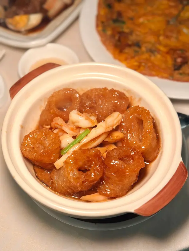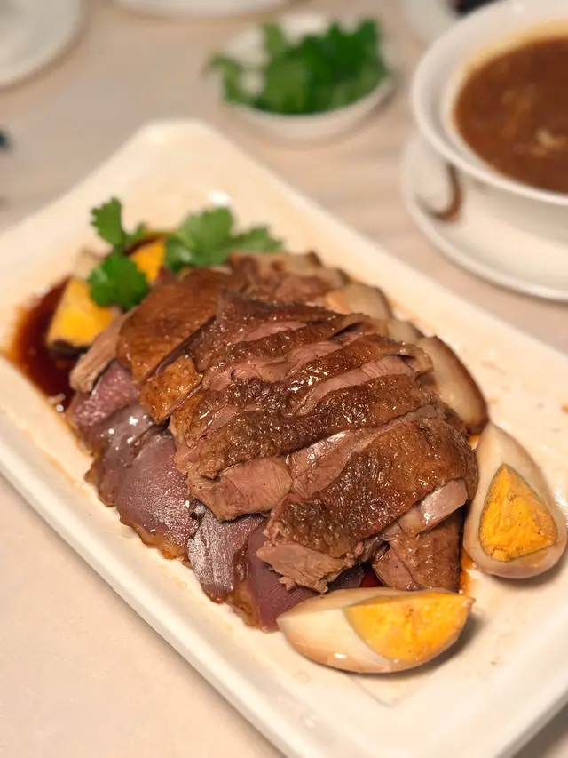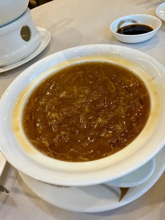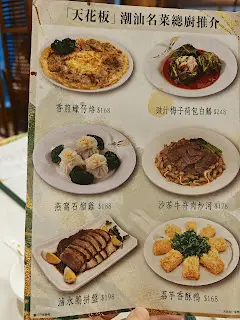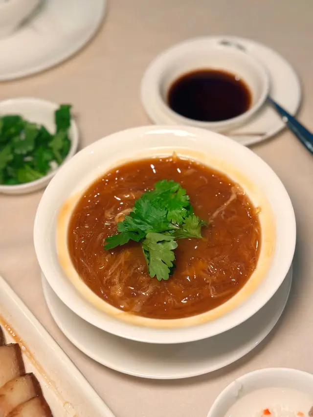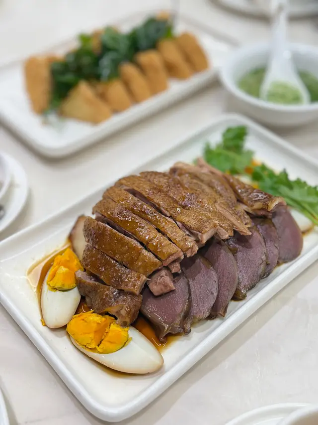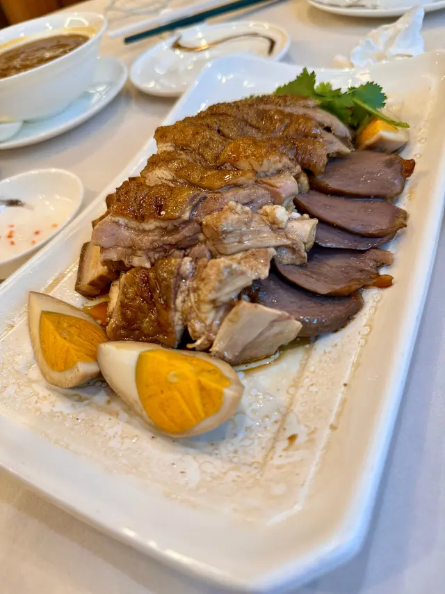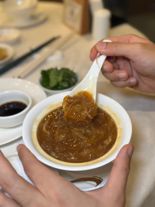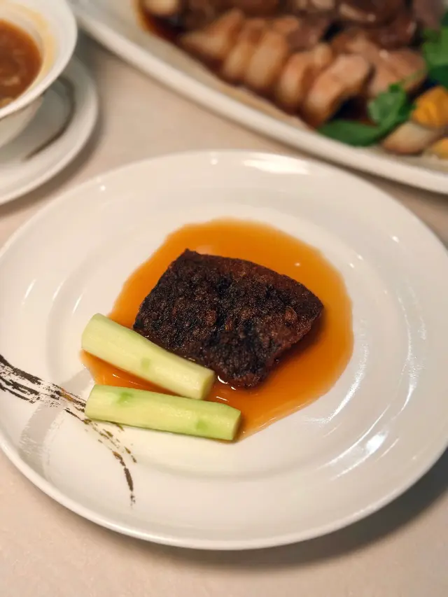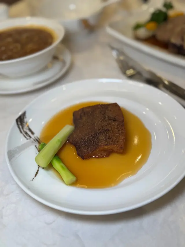 吃得出菜式來自資深手藝的師傅,從味道及烹調方式可見,首次光顧,第一印象良好!除了耳熟能詳的最受歡迎菜式之外,不乏手工菜及傳統菜,廚師推介「天花板」名菜非常吸引,二人飯局,先嚐這些。小食滷水鵝拼盤 $198清醇不過鹹的滷水汁,香氣討好,醃得入味,拼盤有鵝肉、五花肉、雞腎、豆腐及雞蛋。特式凍馬友件(4件) $218處理精緻,整齊的長方塊,已起骨,皮滑肉嫩,放上做成膏醬的普寧豆醬,味道更鮮香。潮州红燒翅 $498足三両牙揀翅,翅針質地軟糯,特別適合做紅燒翅。湯頭黏調濃郁,翅針柔順貼服,啖啖滋味,加少許芫荽,添香增層次。脆皮婆参 $328做得非常好,薄薄的脆口外層、對比軟而有力的內心,入口膠質豐富,鮑魚汁亦滋味。紅燒魚鰾煲(4件) $298再來一道紅燒,因為喜愛湯汁濃郁,魚鰾再上一層次就是花膠,所以同樣膠質豐富,雖然口感比較爽硬,做得好,同樣食得過。混合了蝦、魷魚、冬菇及雞肉,精華盡吸,佐飯不錯。清心豆爽 $36*2名副其實,清澈透明的清心丸很爽口,甜度適中,正好平衡以上菜式的濃稠之味。位於尖沙咀知名食廈,走中高檔路線,佈置明亮,空間足夠,服務到位,值得重訪。…查看更多
