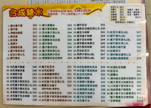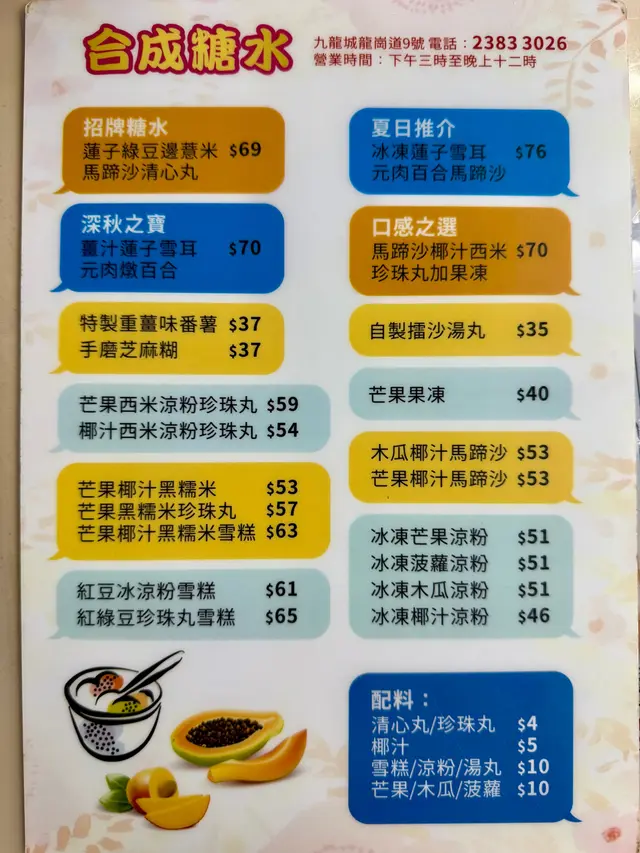 潮州合成甜品 (九龍城) 網址: https://s.openrice.com/QrbS0aW4000~dVXi7MR_t 地址: 香港九龍城龍崗道9號地舖 電話: +852 23833026