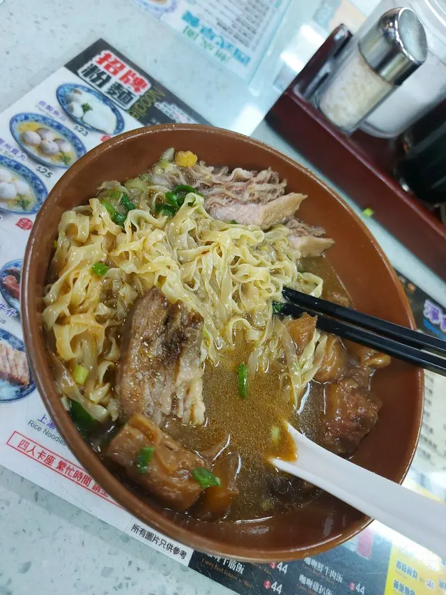 油尖旺有不少潮式粉麵檔, 無論是魚蛋類, 牛腩類還是牛雜類,要找很易, 但要令我印象深刻的, 一是牛腩出色得手執這個區的牛耳, 另一個方向是便宜得成為窮人恩物. 潮成園就是後者, 單項潮式粉麵三十元左右可以交易, 雙拼也只是四十元左右, 吃得飽而又是熱呼呼的粉麵, 真的不能要求太多. 點的是牛腩牛雜河, 兩者配料份量也夠, 內臟沒有發臭, 牛腩肉質有點韌, 河粉沒有糊化, 鹵水並沒有死鹹, 加起來物有所值, 窮人恩物就是這樣已夠.There are many trendy noodle stalls in Yau Tsim Mong. Whether it's fish ball noodles, beef brisket noodles, or beef offal noodles, they are easy to find. However, to impress me, there are two aspects. First, the beef brisket here is exceptionally tender and flavorful, making it stand out in this area. The other aspect is that it's affordable and a blessing for the poor. Chiu Shing Garden is an example of the latter. You can get a serving of trendy noodles for around thirty Hong Kong dollars, and a combination of two types of noodles costs around forty dollars. It's a satisfying and piping hot bowl of noodles, and you really can't ask for much more. I ordered the beef brisket and beef offal hor fun noodles, and both had generous portions of ingredients. The offal didn't have any unpleasant odor, the beef brisket was a bit chewy, the hor fun noodles were not mushy, and the broth was not overly salty. Overall, it was worth the price, and it's a great option for those on a tight budget.查看更多