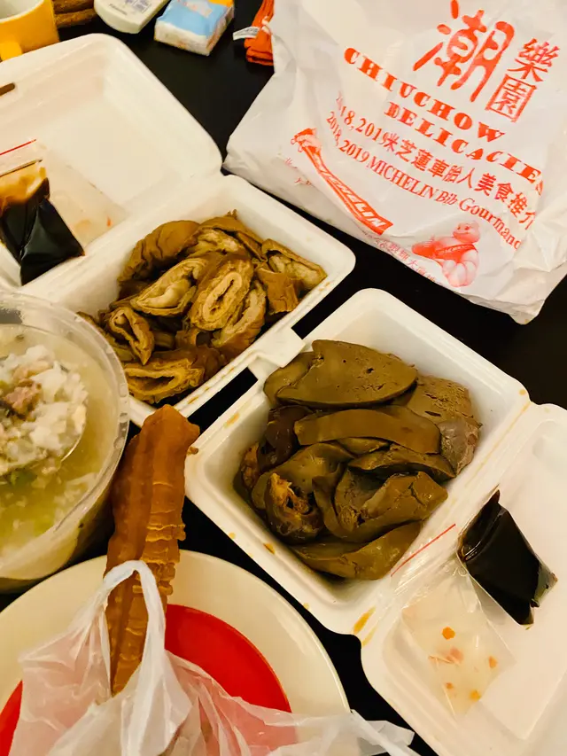 外賣好多次,第一次在大坑的潮樂園堂食,和朋友帶了白酒,點了滷水鵝下裝,啖啖肉,下酒佳品。因為來得有點晚,大鵝羽,鵝掌已經賣光🤨所以只能點了墨魚拼豬頸肉,美味的還有在底的豆腐,沒有被滷水蓋過豆香。吃了時令的上湯浸春菜,感覺很潮州😂可惜這裏沒有煎𧐢餅,只能用𧐢仔粥做代替…𧐢仔粥很鮮甜,清香撲鼻,熱辣辣很喛胃,可謂完美的結局!街坊風味的潮州滷水店,見朋友唔係講派頭,係吹水霄夜精選!🥳😋😅查看更多