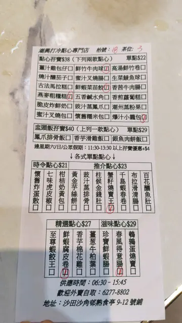 潮興打冷點心專門店 (沙田) 網址: https://s.openrice.com/QrbS05IqF00 地址: 香港沙田沙角街5號沙角邨熟食中心地下9-12號舖 電話: +852 62778802