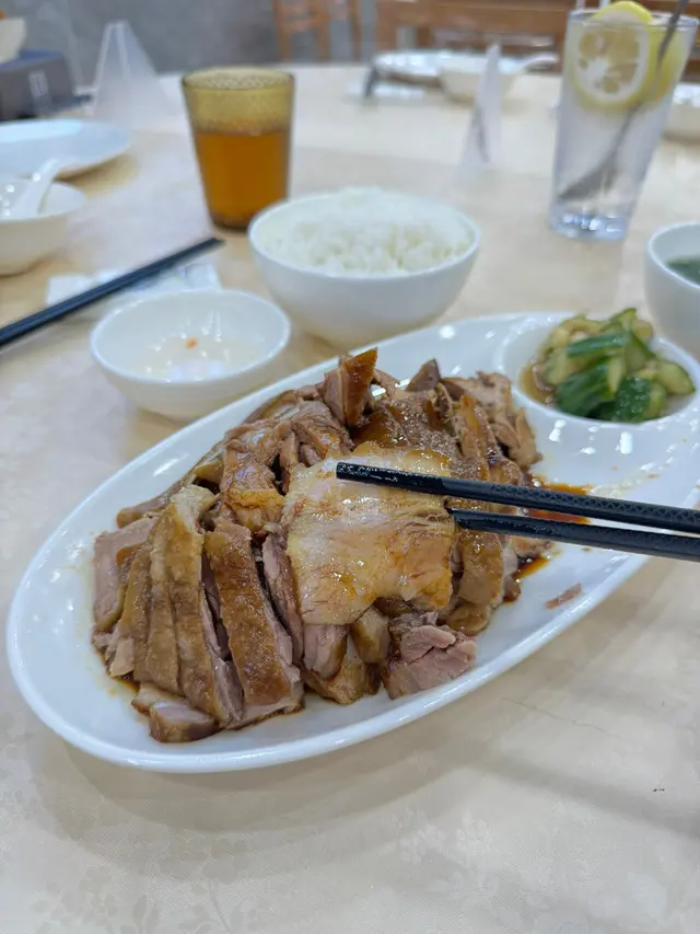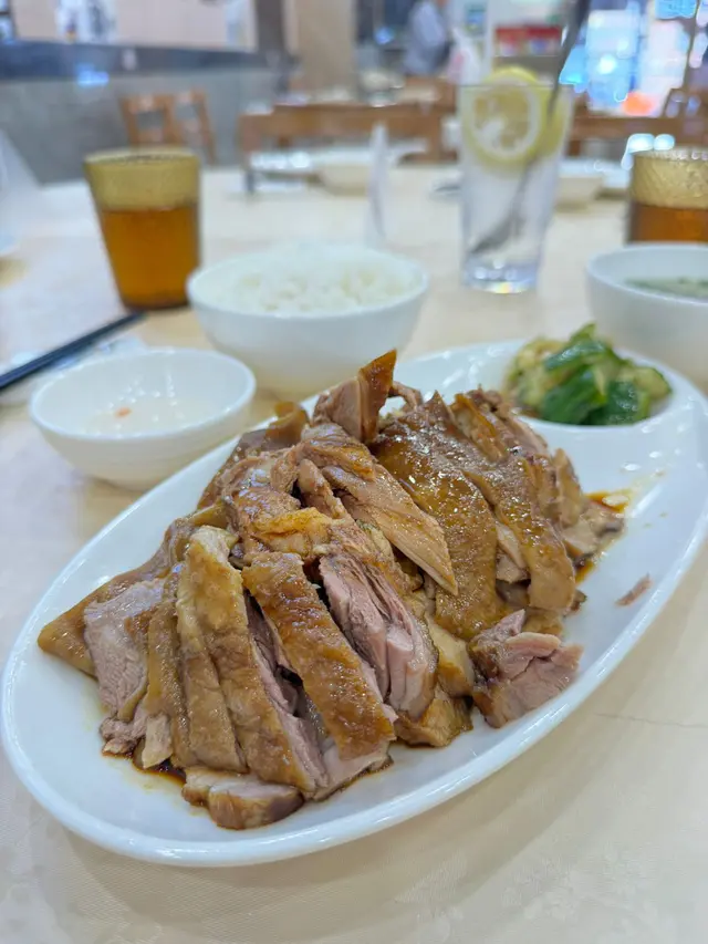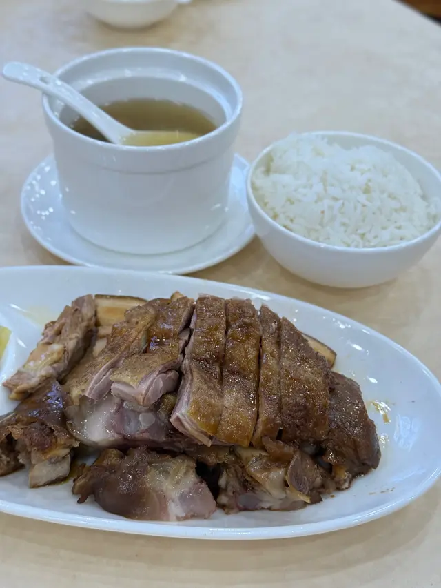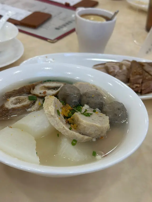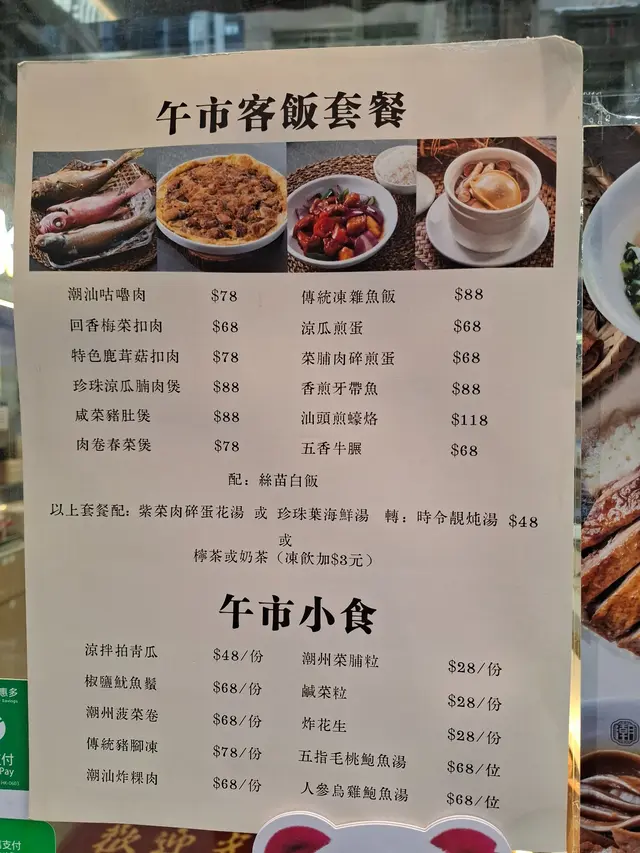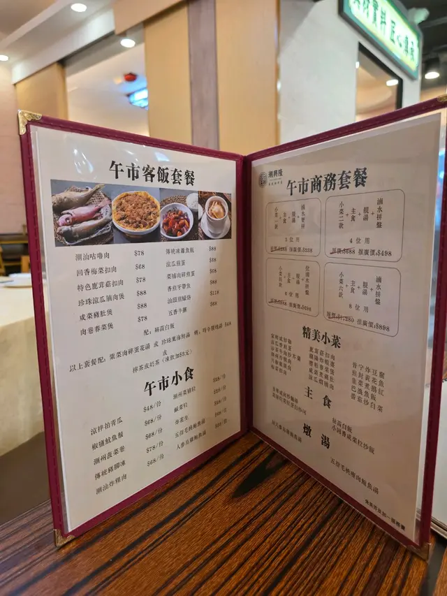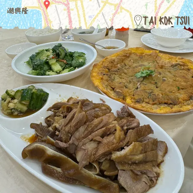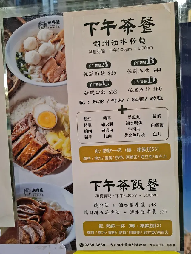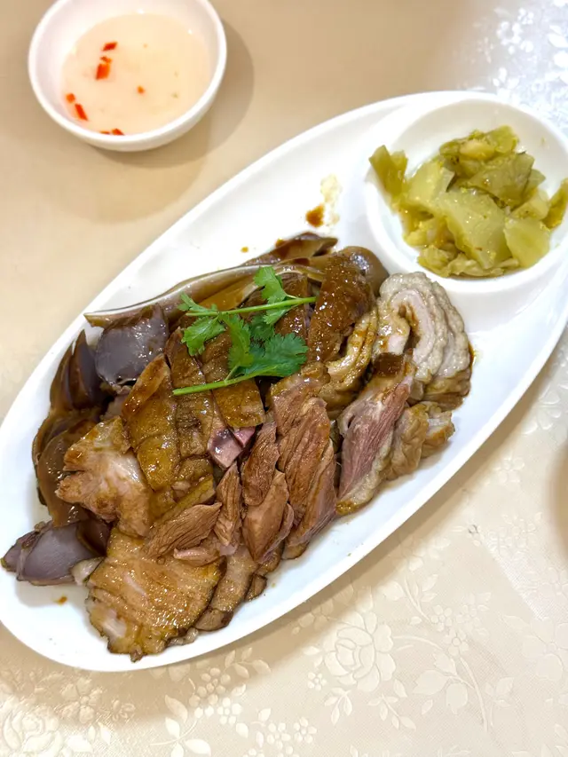 運動後, 很肚餓! 朋友帶我到大角咀, 那邊餐廳價格比較化算, 目標鎖定下午茶! 這個潮州系列的下午茶餐牌, 價格實惠! 所以我倆就在此TEA一TEA.珍珠葉海鮮湯 午餐的餐湯, 紫菜蛋花湯常見, 對於珍珠葉海鮮湯很新奇. 配料:貝類+蠔仔+清湯+香芹+莞茜+金不換+炸蒜 貝類蠔仔煮湯, 有香芹莞茜提香, 鹹中帶鮮甜.珍珠涼瓜腩肉煲 本以為是一般的涼瓜件 & 腩肉, 真身竟然是大大件長方形涼瓜片, 橫放平攤於煲裡. 涼瓜瓜囊已去除, 估計是以壓刀<片>走! 涼瓜炆得軟綿綿, 無需牙力即可享用. 涼瓜甘味仍在, 但煲裡湯汁也有濃濃的甘味. 腩肉皮有燒過的痕跡,而腩肉和脂肪筋膜收縮比例不一。相信腩肉生勾勾放入煲裡跟涼瓜一起燉煮,保證原汁原味。厚身大花菇變成配角了!鵝肉拼五花肉飯+滷水蛋潮州名物滷水鵝, 平時單碟鵝件盛惠百多個大洋.下午茶餐, 鵝肉配飯,還有五花肉&滷蛋, 配飲品, 只需要55元, 計落有著數.鵝肉浸在蒜子醋裡中和肥膩感, 滑滑容易咬, 滷水味柔和, 易入喉. 滷水五花肉, 有肉香也有油香. 蛋半隻,自己獨吞 墊底的滷水豆腐也要沾白醋.凍檸檬茶 走甜少冰埋單免茶介, 免加一, 環境&座位舒服, 抵!下次想食粉麵下午茶雙拼三拼配飲品,還有鵝肝和凍蟹。…查看更多