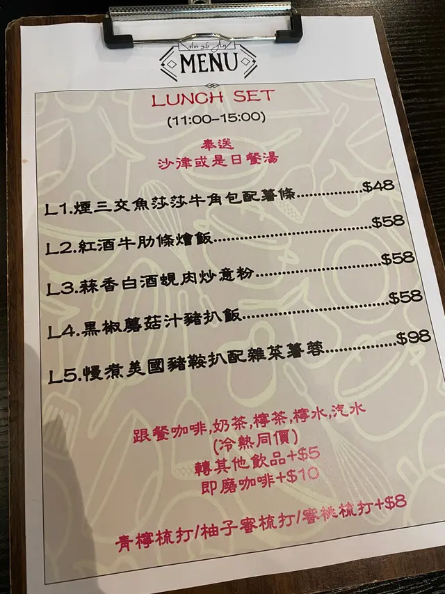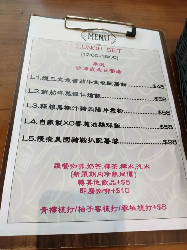 搵石門有咩西餐食,意外搵到呢間 唔知係咪新開呢,之前好似唔多覺有呢間野咁。係openrice訂咗位先去,小店只有3 4張枱,不過當晚冇乜人食,得兩枱客。餐牌設計唔簡陋,都似食緊出面連續西餐廳咁嫁,價錢唔算好小店,唔會話五六十蚊就有,都係平時食開既中等價錢,尚可接受1800-2100送餐湯係南瓜湯睇落顏色好似好淡咁,點知都幾濃,幾好飲大蝦彩椒鮮茄辣汁意粉少少辣,唔係好勁,蕃茄醬亦唔會好酸,成個意粉幾濃味蝦有三隻,幾彈牙有蝦味煙三文魚卡邦尼意粉有兩至三塊煙三文魚意粉卡邦尼汁算多,但唔算非常濃郁,少許火腿配料叫左個小食黑松露薯條呢個反而意外地好好味黑松露醬味道適中,淡淡黑松露味,唔會太勁薯條好香脆,裡面好多薯仔另叫錢餐飲,梳打,味道唔錯總結食物份量適中,味道唔錯,價錢略高,不過可接受,不過食物選擇唔太多…查看更多