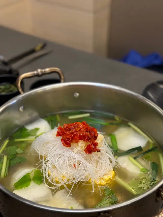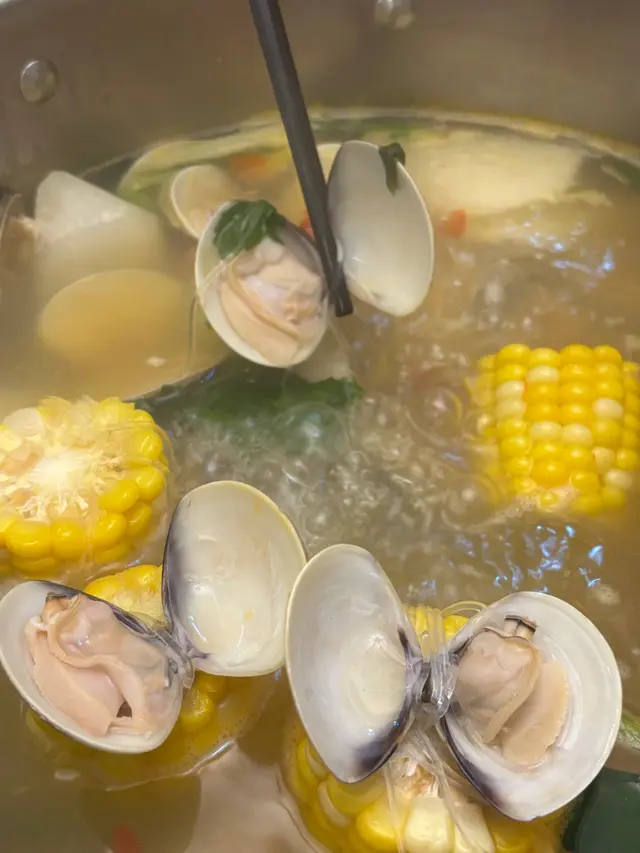 鮮味卜卜蜆鍋 大隻的卜卜蜆鮮甜可口,搭配粉絲、甜玉米和白蘿蔔,湯底濃郁,味道極佳,讓人一口接一口,欲罷不能。