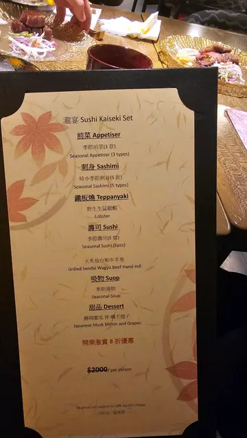 Lunch時段嘅套餐都幾抵食,而且仲有開業激賞有8折,吸引不少客人前來品嘗。今次就試左佢地嘅「瀧」及「宴」set,前者有前菜、刺身、鮑魚、蝦、牛肉、炒什菜、炒飯及面豉湯,而後者有前菜、刺身、壽司、鵝肝、蝦、牛肉、炒什菜、炒飯及面豉湯!