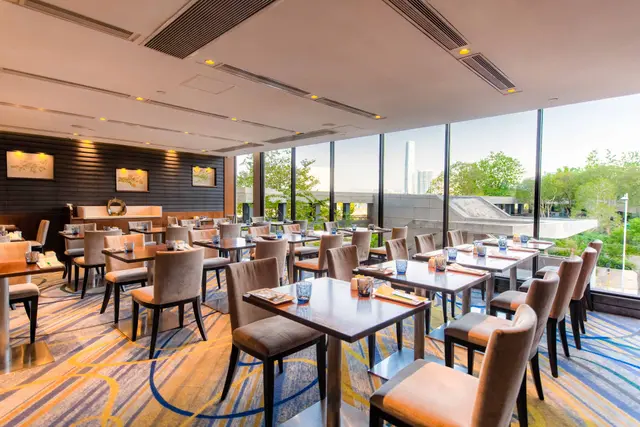 灣景廳的裝潢充滿時代感,以深淺不同的原木色調配搭深色地毯及玻璃鏡面,格調高雅,賓客亦可透過餐廳的落地玻璃窗,欣賞維港日夜的優美景色;餐廳除供應豐富的自助早、午、晚餐外,亦設有精緻的自選菜譜,定能滿足每位客人的口味。
