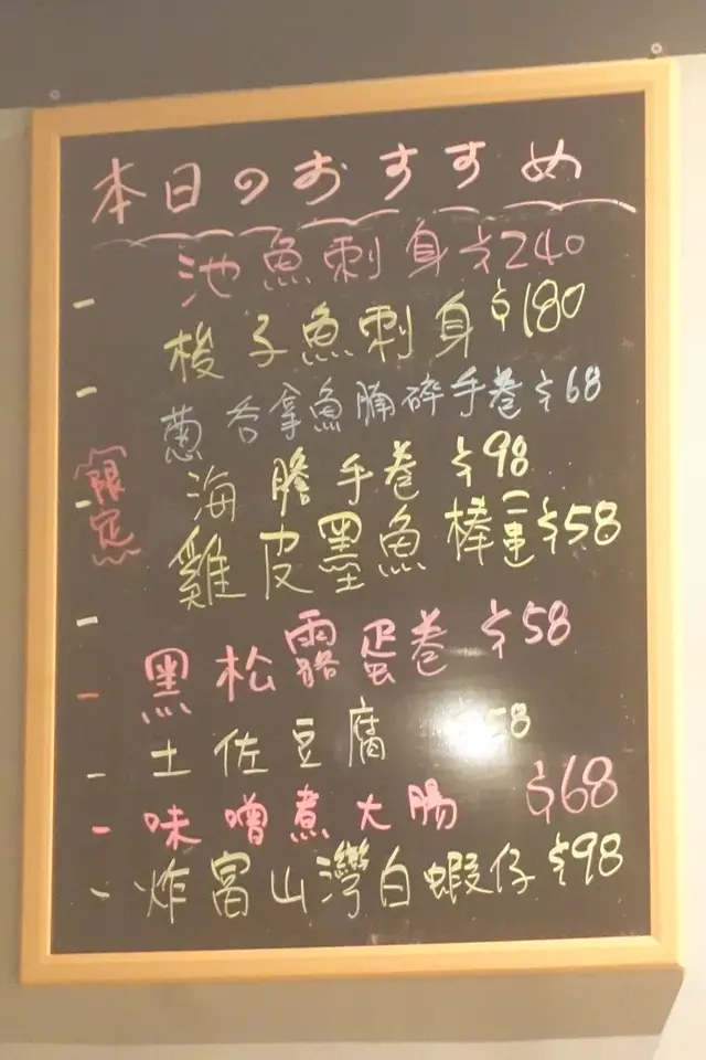 Menu供應:刺身、沙律、酒肴、串燒、揚物、食事、酒類...等