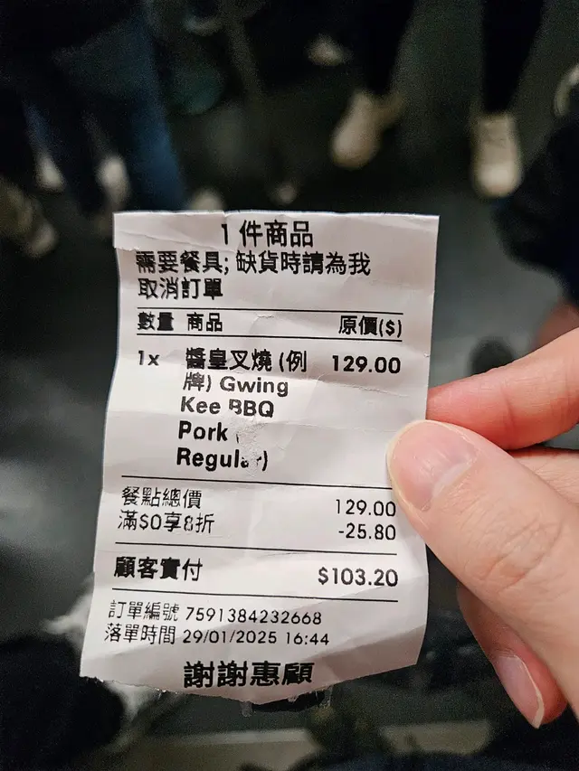 外賣自取實物不乎合圖片,100蚊叉燒份量極少得幾粒, 同四十幾蚊撈麵餐份量差唔多,又樣衰,亦比店面買的同樣份量價錢的貴一倍以上,店員謊稱售價是平台自己訂立,跟自己無關。已經向外賣平台舉報,平台亦向商家要求了更換誤導份量的參考照片。我平時經常用外賣App自取幫襯佢,就信任咗佢直接買佢100蚊叉燒,非常失望。仍然申請退款中(至少要部份退款),但商家一直堅持份量正確,以後唔會再幫襯。查看更多