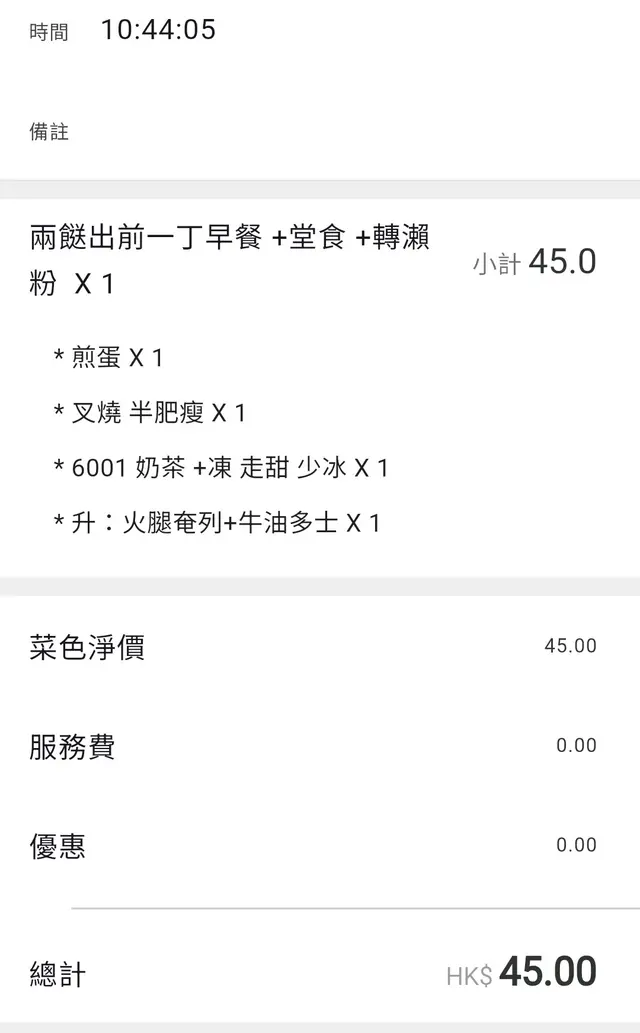 今日見完工朝早十點都未夠,未有太多舖頭開門,喺有限嘅選擇之下揀咗呢一間小店。呢間喺商場外面地下嘅舖頭,自稱鵝油撈麵喺signature,本身好想試下,但早餐時段冇呢個選擇,唯有揀啲普通嘅常餐醫下肚。呢間小店可以坐到三,四十人。早餐時段見到有四五枱客。我揀咗叉燒蛋瀨粉(佢自助落餐,雞蛋可以揀煎蛋,炒蛋,太陽蛋同全熟蛋; 湯粉方面有通粉,米粉,仲有平時好少早餐時段出現嘅瀨粉),加八蚊一個火腿奄列同半塊多士,仲有一杯凍奶茶(加3蚊)。埋單45蚊。等左約5分鐘所有野齊晒,我落單時揀咗半肥瘦叉燒(佢好多選擇,肥啲,瘦啲,燶邊,半肥瘦),但無得揀荷包蛋,所以將太陽蛋浸落湯嘗試制造相似效果