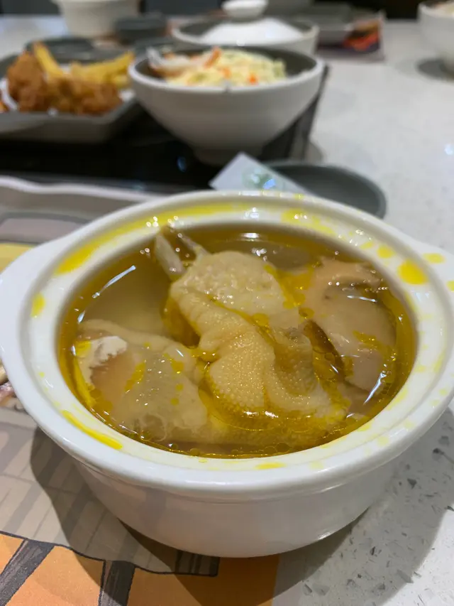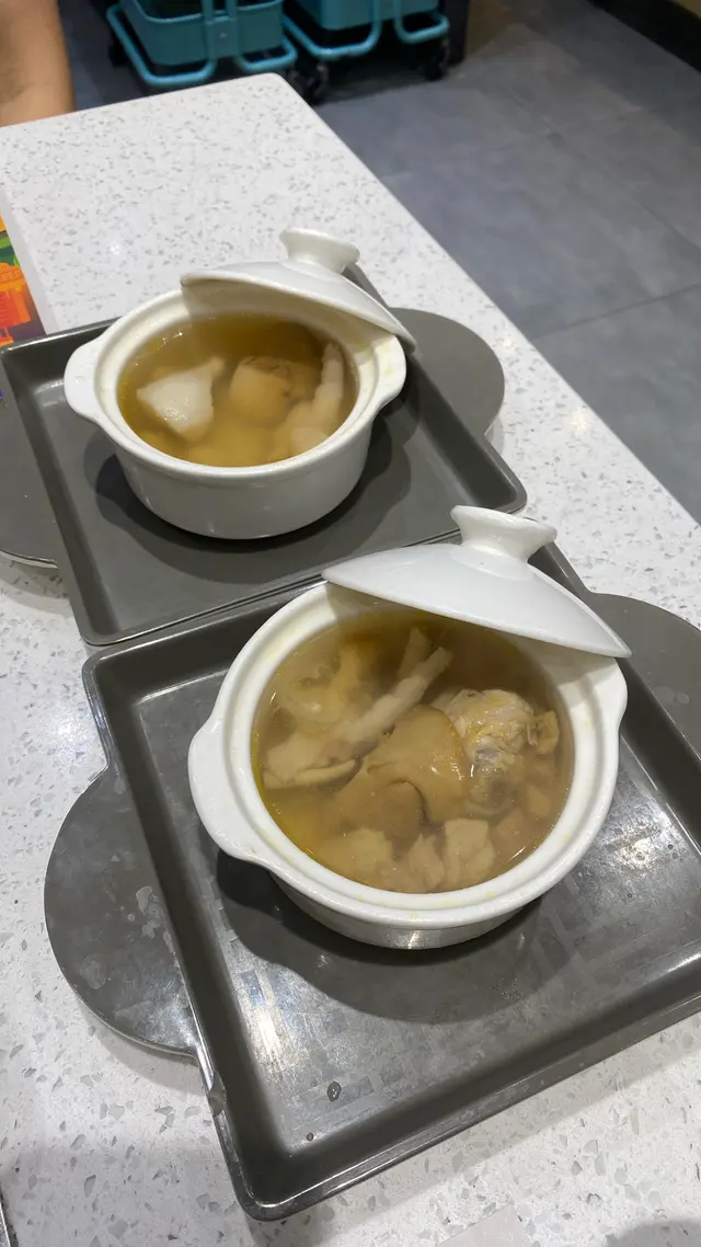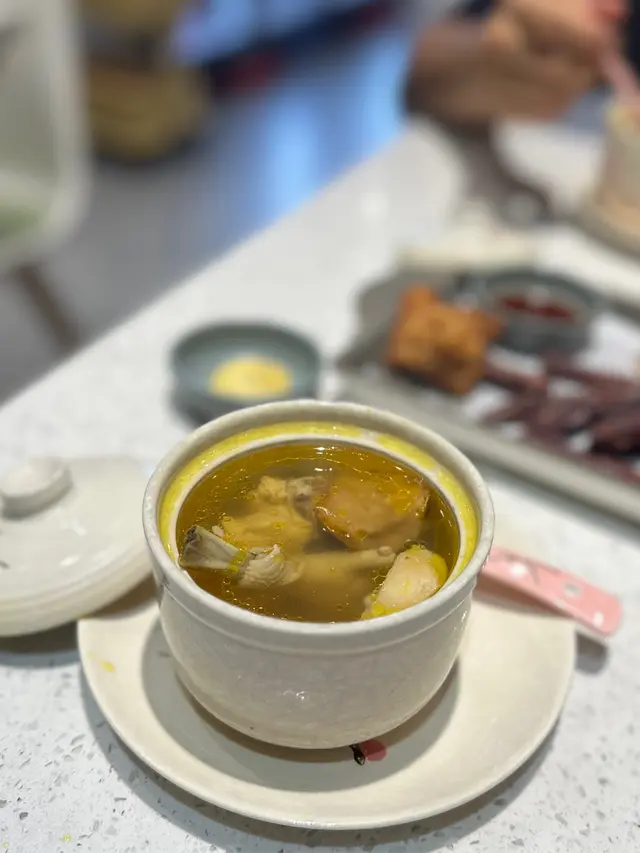 奉送時令燉湯需早一天訂座及確認選餐,特色之一是餐廳會用當季最新鮮食材熬製,保證足料,夠火喉,色澤金黃透亮,湯頭散發濃郁雞香,入口鮮甜,味道醇厚養生。