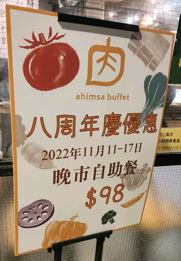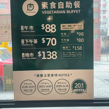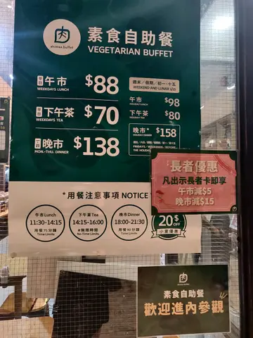 聽過好多人讚好「無肉食」,今日就請阿叔和細佬去試下。星期五、六、日、假期、假期前夕和齋期晚市每位$158。原來長者有優惠,每位減$15。原本晚市用餐限時90分鐘,但今天是星期五,竟然沒有限時,真是喜出望外!一進門口,有位很親切的姐姐招待我們,令人感到很舒服。我們是第一批客人到場,所以可以隨便選座位。 未到6pm開始的時間,食物區已準備了各式各樣的食物,但仍見有食物斷搬出來。6pm一到,忽然有一大班長者進來,取了外賣盒就到食物區取食物。我以為這間餐廳是專做外賣的,過,再過了一會,就有好多堂食的客人進來,最後是幾乎滿座呀! 食物方便,選擇非常多,而且refill的速度很快,這款食完就會有另一款補上,我食到好飽都未能每一款都試完。食物的味道很不錯,尤其是齋义燒,真是很好味!可以知道㕑師是一位好有heart,好有創意的人。我食得好滿意。