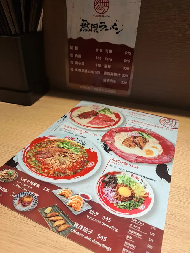 來自大阪嘅「無限拉麵」落戶灣仔區,今日專登過嚟試!一入門口已經聞到陣陣牛骨湯香。店舖裝修完全係典型日式拉麵店風格,麻雀雖小五臟俱全,夠晒乾淨企理,真係有秒到日本嘅感覺~特製和牛牛骨白湯拉麵 $168真心無介紹錯!每日限量200碗真係有原因,個湯用牛骨熬到奶白色,濃到黏嘴唇,原來店家仲要用日本儀器測濃度,難怪咁足料!塊和牛慢煮10個鐘,入口即化得嚟又有咬口,油脂分布靚到似雪花。麵條指定粗度硬度,掛湯能力一流,每啖都係享受~日式拌麵 $108個人私心推薦!醬汁撈勻之後每條麵都掛滿蛋黃同特製醬油,食落鹹香帶微酸,好惹味開胃~最驚喜係店家提供一次性圍裙,唔怕撈果時彈到成身汁,超細心!餃子 $45煎到金黃蕾絲脆底,咬開肉汁爆出嚟,點埋醋食真係停唔到口~青森蘋果汁 $20 / 烏龍茶 $20食完濃味嘢飲返支冰凍嘅青森蘋果汁,或者烏龍茶解下油膩都唔錯~總括嚟講,呢碗「特製和牛牛骨白湯拉麵」充分展現咗日本過江龍嘅功架。今次唯一遺憾係兩款人氣產品 —— 「雞皮餃子」同「牛骨麻辣叉燒拉麵」都早早售罄,唯有留待下次約埋朋友再黎闖關!…查看更多