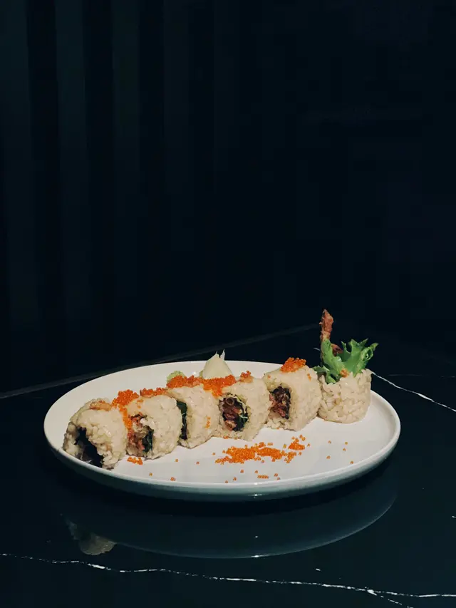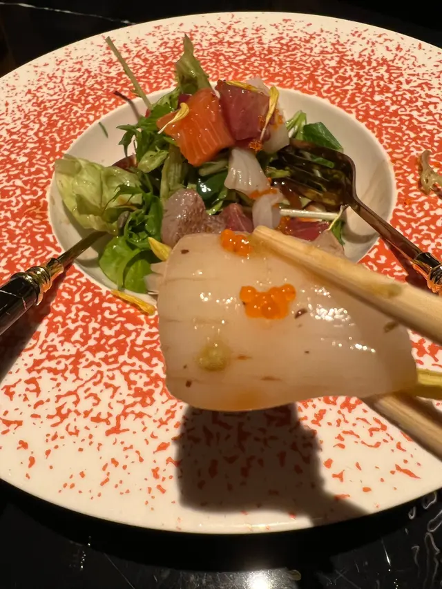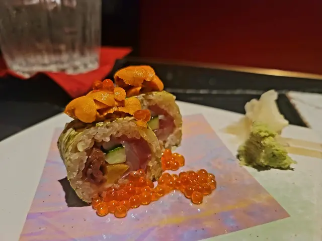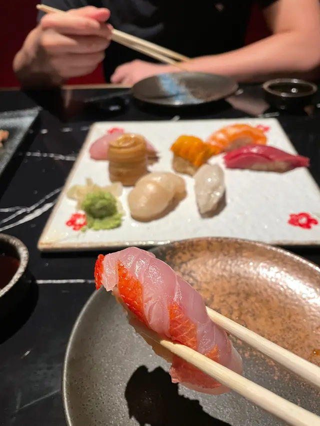 經過門口以為是普通一間酒吧、原來內裡是一間西日fusion餐人廳、環境闊落舒適。焰極上手握壽司搵盛合(10貫)賣相好靚啊!有金槍魚腩、雲丹、金目鯛、油甘、赤身、全部都好新鮮呢!火炙左口魚油潤肥美、超好吃。壽司用上赤醋飯很講究。帆立貝刺身肉厚肥美。點了牛舌和黑豚豬腩串燒、燒得剛好仲有肉汁。彩虹繽紛卷賣相好靚、裡面有三文魚、吞拿魚、芒果、牛油果、加上卜卜魚子、口感豐富。法國鵝肝赤海老茶碗蒸一送上來鵝肝香氣撲鼻、赤蝦爽滑彈牙、滑溜的蒸蛋吸收左鵝肝赤蝦香氣味道濃郁、大滿足、一定要試!松葉蟹肉雲丹鮭魚子。蟹膏釜飯蟹蓋上鋪滿海膽、蟹肉、三文魚子、在炙燒的鍋裡抄拌勻、蟹肉非常鮮味、加上蟹膏、好香!旁邊的飯焦仲脆卜卜~整體來說食物精緻高質、環境舒適、值得再來。查看更多