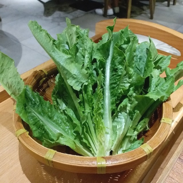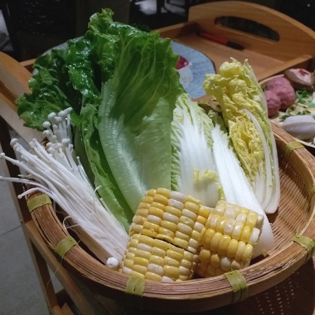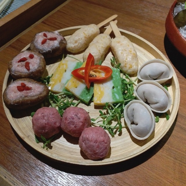 新鮮時蔬籃適合放入藥材鍋裡煮,新鮮可口手工火鍋拼盤黑松露豚肉餃子、鮮蝦雪條棒、太極鮮冬菇、花椒牛丸、元貝三層墨魚磚甜點是柚子凍~