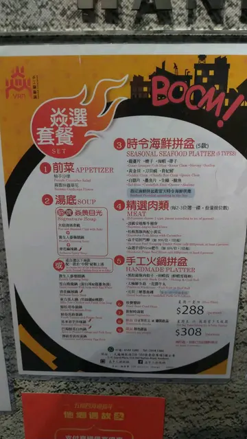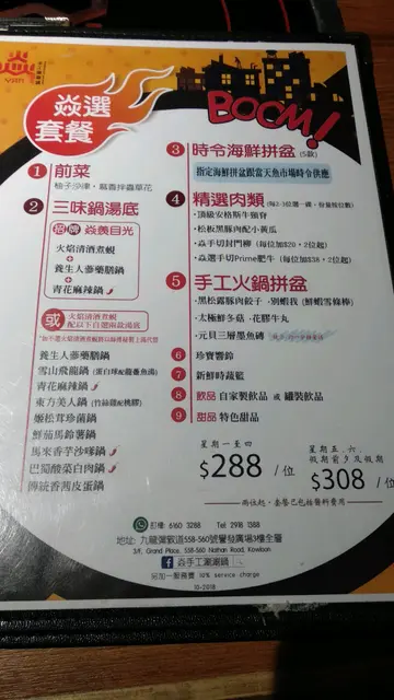 已經係第二次食既焱手工涮涮鍋,話說經過開旺角,女朋友話掛住依間火鍋既湯底,甘就即日經open rice book位,享受佢既85折優惠去到叫左個套餐,人頭300蚊到,包個招牌湯底。一邊麻辣,一邊就藥膳人參湯,而中間呢,就係酒煮蜆鍋,店員先把蜆同酒精加入中間既鍋,之後叫我地準備相機,就點火。影完相就加湯底煮蜆同打邊爐套餐包括海鮮拼盤,店員建議海鮮可以用中間既鍋底打,鮮味會突出啲牛頸脊份量夠兩個人食另外仲有丸類拼盤同當日時蔬等即炸響鈴,大大舊熱辣辣總括而言,鍋底好味加上食材新鮮,環境企理闊落,坐得舒服,值得一提既係,店員既服務真係好好,主動幫我地拍照,又會提供煮食建議比我地,十分熱心nice已經係第二次去,仲會有下次