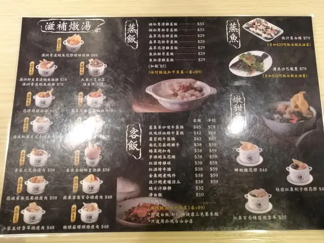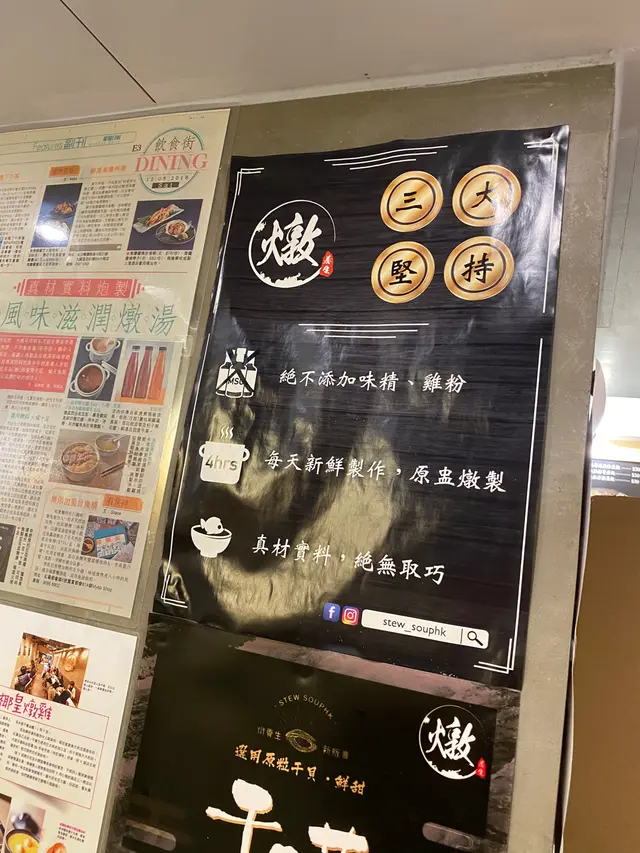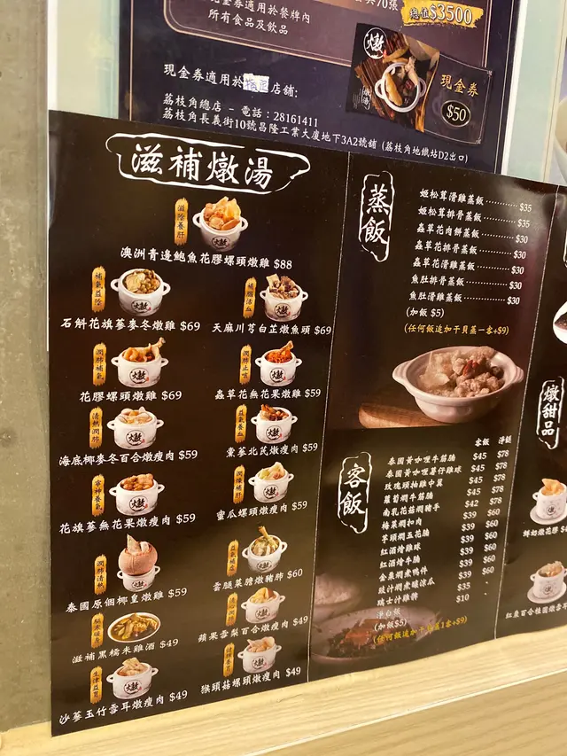 香港人鍾意飲老火湯,呢間燉湯店起正荔枝角港鐵站出口隔離,容易搵,而且湯水選擇都幾多,都係滋補款,男女老少都啱飲,有時行開附近都會特登過嚟飲啖湯,個人最欣賞佢個天麻川芎白芷燉魚頭湯。呢間勝在價錢親民,出貨快唔使點等,湯水無味精(所以會偏淡,可以問店員攞啲鹽),店面整體都算衛生嘅(佢荔枝角店係外賣自助式,所以有時會出現啲嘢食完冇人收,積咗起張枱度嘅畫面)。如果對湯水冇太大興趣,佢都有糖水,蒸飯,中式小食可以試吓嘅,甜品個人推薦花膠燉鮮奶; 小食嘅佢個蒸白鱔都唔錯,幾鮮甜,不過好似係時令,唔係成日有。另外,好多人都知呢間店係某個TVB藝人開㗎啦,如果有心想見吓藝人,聽講佢周不時會親自起店面服務,見過佢親自收銀,抹枱,收垃圾同跟單,對啲客人嘅合照要求有求必應,又會同客人講多謝支持,幾貼地。我起佢間鋪見過佢2次,2次都係週五傍晚。