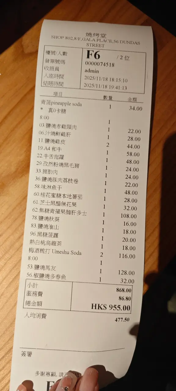 燒烤堂 (旺角) 網址: https://s.openrice.com/QrbS0M4iF00 地址: 香港旺角登打士街56號家樂坊8樓802號舖 電話: +852 98860397