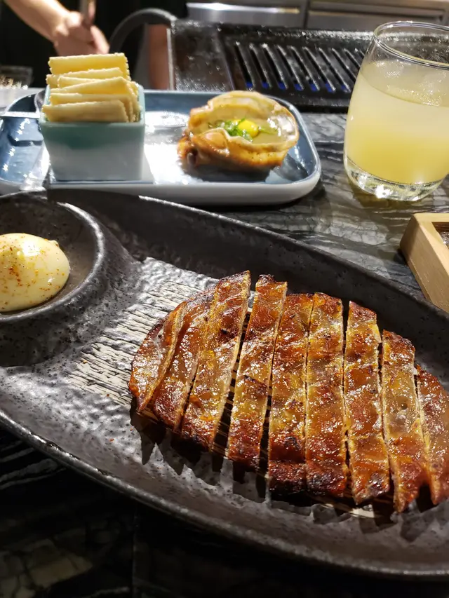 走進這間日式居酒屋,仿佛被帶入了日本街頭巷尾,燈光柔和而溫馨,木質裝潢,很有親切氛圍。播著輕音樂,為空間增添了幾分悠閒情調。價格屬於中上消費,呢度仲提供任飲清酒選擇,從清爽吟釀到濃郁純米酒都有。鹿兒島A4和牛盛盒有三款和牛: 三角胸小排、肉眼蓋和背峰,牛肉色澤光亮,雪花肉紋分明,肉質鮮嫩多汁,脂肪細膩口感瞬間在口中化開,很高質。美國封門柳呢款牛味特別濃郁,燒至表面微焦,肉質緊實卻不油膩,好多肉汁。一夜干雞全翼一份2件,外皮金黃酥脆,有微微煙燻香氣,很有鹹香。炭火雞賣相簡約,外表焦香,搭配一點青蔥點綴,炭火香氣深入其中,很軟滑。伊比利亞豬肋條肉質厚實而且多汁,外層有焦脆感,吃到豬肉自然風味,搭配微甜醬汁,讓整道菜品更加豐富。波板糖豚肉串(2串)這道豚肉串外觀十分討喜,外層帶有微微甜味,很有口感!白鱔很新鮮,搭配簡單調味,就保留了海鮮鮮味,口感彈牙,搭配一點檸檬汁,更能突顯出海鮮味。赤魷魚筒大大隻魷魚筒,肉質鮮紅,烤制後表面微焦,肉質彈牙,帶著淡淡海味。甲羅燒外殼盛載嘅螃蟹肉細膩,蟹膏味濃郁,很juicy!