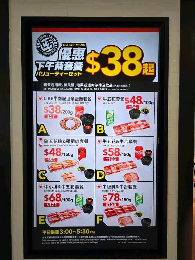 日本一人燒肉專門店「燒肉 LIKE」推出咗全新優惠下午茶套餐😍,激抵食高質一人燒肉 Tea Set 最平$38 起🫢!!真係超癲😳!!我第一時間就走去試吓,睇吓賣到咁平係咪依然咁高質😆。「燒肉 LIKE」喺全線分店推出 $3️⃣8️⃣起嘅超抵優惠下午茶套餐,逢星期一至五下午 3 點🕒至 5 點半🕠期間(公眾假期除外),以低至$38 嘅超值價帶嚟6️⃣ 款下午茶選擇,包括多款人氣燒肉部位選擇,部份套餐計起嚟仲抵過半價😍!!牛五花套餐 $48 (原價 $64)套餐包括飯🍚、和風湯🍵、泡菜🌶或迷你沙律🥗及飲品🥤,真係勁抵;牛五花🐂油脂飽滿充沛嘅牛五花口感軟嫩適中,烤至微焦後🔥,肉味濃郁😋!牛板腱 &牛舌套餐 $78 (原價 $155)油脂較少、嫩中帶爽口嘅牛板腱,以及柔嫩嘅牛舌,啱晒Duck哥🦆呢個牛魔王😂!叫任何下午茶套餐仲可以以限時優惠價$15 起追加單點肉品👇🌟牛板腱 50g +$35(原價$40) 🌟壽喜燒牛五花 50g +$25(原價$28) 🌟豬五花腩肉 50g +$15(原價$20) 🌟豬頸肉 50g +$27(原價$30) 🌟雞腿肉 100g +$25 (原價$32) 總括下午茶價格超抵,但整體質素都一樣咁好,唔怪之得人龍不絕!查看更多