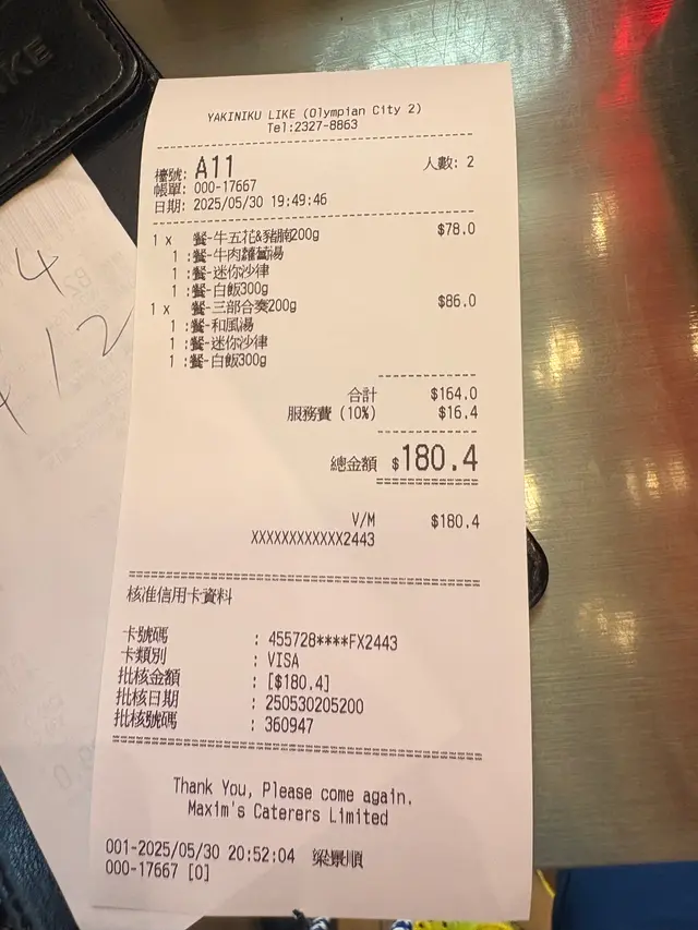 次次去奧海城都經過喱間「燒肉LIKE」,但次次都勁多人等位,見佢今日比較少人所以攞咗張飛等吓,50分鐘左右就有得入。店舖抽風系統幾好冇異味,可惜坐位比較窄,張枱比較…油。一坐低就點咗《200g牛小排&牛板腱套餐》包括:牛肉,白飯,和風湯,迷你沙律。唔駛10分鐘d野就到齊都算幾有效率。沙律好食個湯好飲白飯唔錯,200g嘅牛肉薄砌一片片薄到透光,醬汁有10款任君選擇,個人比較鍾意「辣味噌醬」,「蒜香醬油」和「胡麻醬」。總結:算幾好味,但唔飽,去咗茶餐廳宵夜。後記:這家餐廳的侍應哥哥好有禮貌好有耐性非常抵讚,但,QRCode 落單 及 全電子支付不收現金,極之討厭。查看更多