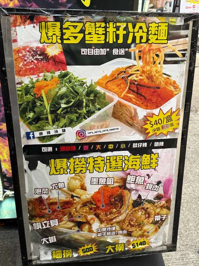 我又鍾意食辣,又鍾意食海鮮,又鍾意掃街🥳依度就岩曬我了🥳爆撈特選海鮮~裏面有鮑魚、帆立貝、帶子刺身、墨魚咀、魷魚、大蝦、螺肉😍相當之足料,可以因應個人嘅辣度去選咩辣度,又辣又惹味!爆多蟹子冷麵~童年回憶再加上爆多蟹子,仲要份量大到一個點😎非常之足料,因應個人嘅辣度去選咩辣度🫶🏻仲有童年回袋裝冷麵,我全部冷麵都揀左中辣,比一般嘅辣辣多半度,食得辣嘅我建議食中辣試下先😌我食左咁多野好似好大食咁🤪又真係幾大食嘅😂