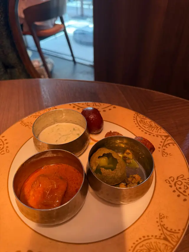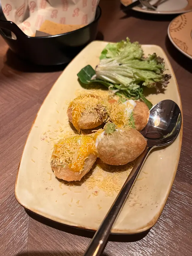 今晚來到尖沙咀一間創立於1972年的印度餐廳晚膳。餐廳裝修華麗,富印度風格,有室內及寬大户外露天部份。設有雙人、四人及長枱,還有半圓卡位,迎合不同顧客。餐廳不時會有現場表演,今晚便剛好有電子琴彈奏。坐下來,服務員先送來個歡迎小食:“印度青咖喱+脆片”。餐牌內菜式選擇頗多,有印度特式小食,沙律,海鮮,燒烤,湯,飯,飲品及素菜等等。前菜:“五香羊肉餅”迷你羊肉漢堡扒,加入了多種香料,香味濃郁。“牛肉果芒果伴脆麵餅”脆皮炸球,餡料是果蓉,鹹中帶甜,雙重口感。“酥炸菠菜配洋蔥蕃茄沙沙伴薄荷羅望子醬”