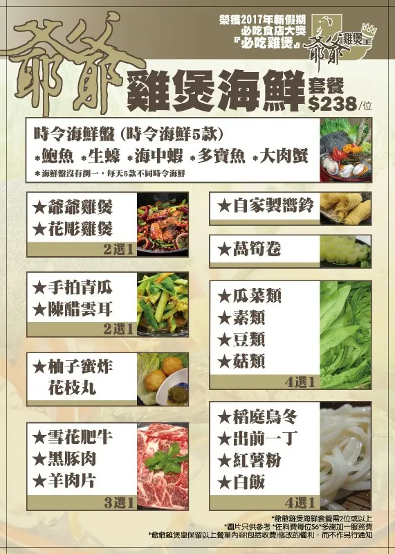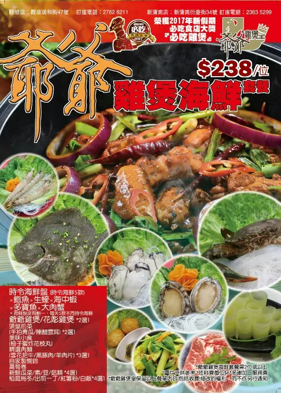 本人最愛就係打邊爐,但要搵平靚正就比較難,近排試過新蒲崗爺爺,覺得值得推介。呢個雞煲海鮮餐,先黎食個雞煲先,大中小辣或者唔辣都得,我本人唔食得太辣,於是點小辣,雞煲香口,好食,份量足。食完雞煲,加湯打邊爐,跟餐仲送一碟手切肥牛,炸蝦丸,拍青瓜,響鈴,䈑筍,生菜,烏冬。海鮮方面,全部新鮮,有蝦,有廣島蠔,有蟹,鮑魚,仲有魔鬼魚,全部好有水準,隻蟹新鮮到放落湯仲識郁,而且多膏肉厚,最後結果都食唔晒,生菜同烏冬都要打包,叫埋啤酒,兩人都唔洗600蚊,甘抵,去邊度搵?查看更多
