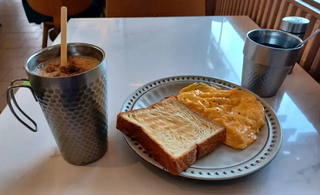 其實這裡的早餐款式跟其他沒什麼分別, 但食物的質素算是不錯。 雖然附近也有不少的餐廳或快餐店,光顧的人也不少。 今天我點了特價早餐,就是:火腿通:湯底好像是雞湯,味道濃,都不錯;炒蛋:都是牛奶炒蛋丹麥包:都好食;熱檸檬飲:發覺這裡的檸檬茶是沒有檸檬的,檸檬的酸度也不夠, 雖然可以免除客人省力,但味道跟新鮮的檸檬有很大的差別呢!這不是我想要的檸檬茶啊!不過,整體而言,冰室的食物質素和味道算是不錯的!
