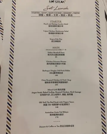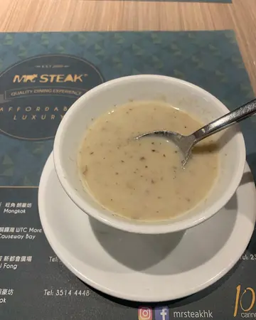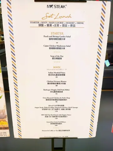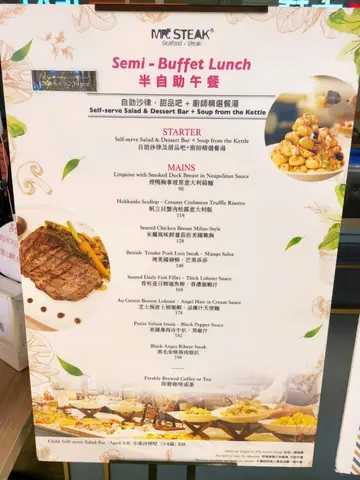 我相信Mr Steak🥩 嗰個buffet好出名唔使我講,但係佢嘅lunch半自助餐buffet其實都好吸引💗不過就去到14:30😒我哋做去到嘅時候已經係14:00所以唯有揀食Lunch set,原來佢哋個Lunch set都非常之抵同埋品質都非常之好👍🏻有齊晒餐湯,頭盤,主菜,飲品,甜品🍮環境又舒服😌頭盤蜜桃海蝦田園沙律🥗海蝦鮮甜彈牙,蜜桃🍑蔬菜新鮮爽脆餐湯忌廉蘑菇湯新鮮蘑菇製造味道濃郁主菜美國🇺🇸SRF極黑薄牛扒配黑椒汁牛扒香濃鮮嫩多汁,牛味濃郁配埋佢個薯蓉一流甜品朱古力🍫 tiramisu蛋糕甜度啱啱好,唔會太甜太流。蛋糕鬆軟,細細舊,食埋呢個甜品就啱啱好🥰🥰🥰…查看更多