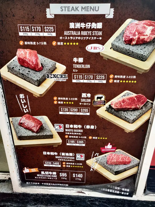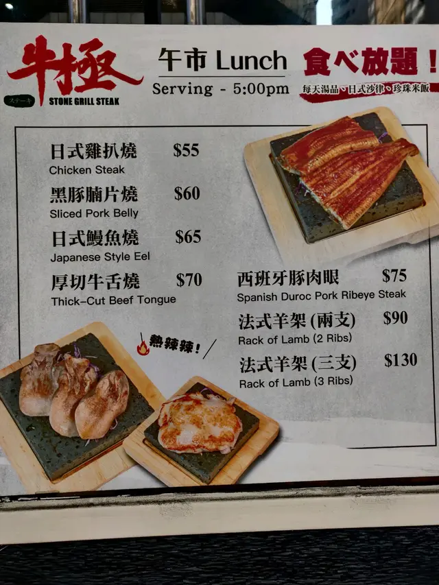 日式自助石燒牛扒店,牛扒有不同部位及重量選擇,均經過熟成處理,會由師傅先煎至一成熟,再放在攝氏300度的火山石板上,客人可按喜好自行用石板燒至理想熟度。牛扒餐皆附自助吧,可任食沙律及飯。