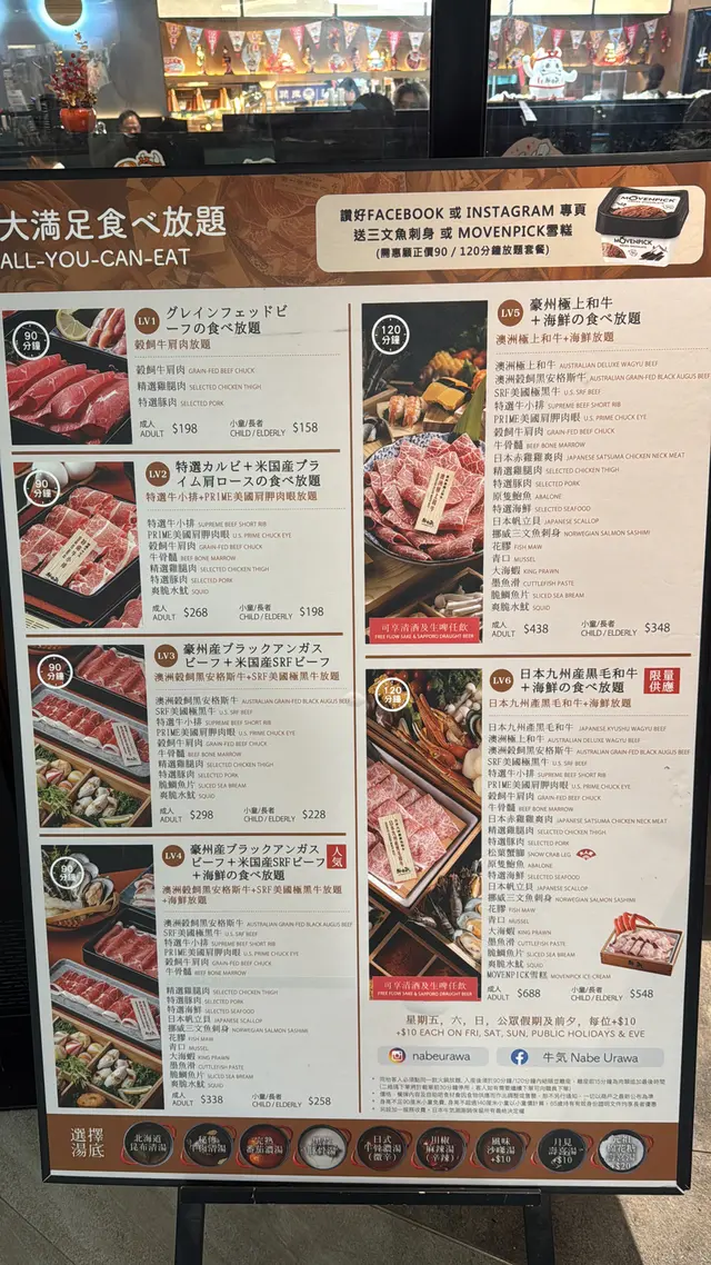 今天是平日的中午,有60分鐘的定量午市套餐,價錢相對地划算,定量餐牌不會放在門口的當眼位置,而是在餐廳的宣傳單張內,大家請留意一下。我和老公分別點了C和D餐,湯底選了日式牛骨濃湯,肉類是定量的,之後熟食/甜品/其他火鍋配料和飲品等等可以任食。熟食的選擇雖然不多,但看起來挺吸引的,當中雞翼和燒賣很美味,雞腿則味道太辣味道一般,而火鍋配料選擇亦有很多,丸類的味道相當不錯。至於肉類方面,特選牛小排的肉質最為嫩滑,而且亦充滿著濃濃的牛肉味,美國極黑和牛的口感則略為粗糙,個人便不太喜歡了最後安格斯牛的牛味最重,但是我老公卻說有很重騷味,當牛味太濃郁時,便可能變成了騷味,我喜歡羊肉的騷味所以這款沒有問題,不過雖然口感都算柔軟嫩滑,但是我都是最喜歡牛小排入口即溶的感覺。至於甜品方面,坦白說便沒有什麼選擇了,可以自己製作軟雪糕,但是奶味不重,其他餐廳自家製甜品亦不好吃,現成的雪糕只有兩款,選擇並 不多。飲品方面,餐廳沒有自家製茶類,差不多全部都是含糖的飲料,烏龍茶只有兩款,但是兩款都不好喝,茶味很淡。價錢方面,定量C餐$138,D餐則$168,餐廳設有加一服務費,最後兩人總共$337。總結來說,雖然定量套餐只有60分鐘,時間很緊迫,但是勝在性價比高,不過加一之後其實價錢都不算真的很便宜,餐廳的熟食很吸引,下次我們應該會點最便宜的定量A餐$88,可以主攻熟食和丸類。…查看更多