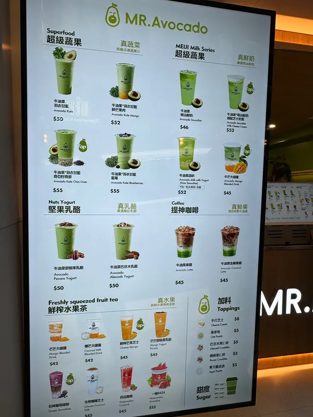 喺中環食完午餐嚟咗呢間專門賣牛油果飲品嘅舖頭買嘢飲,諗住健康啲🤣$52「牛油果羽衣甘藍鮮肉芒果 Avocado Kale Mango」:用咗一隻牛油果🥑,夠晒滑,有牛油果🥑清香,又有啲芒果味🥭,仲有啲羽衣甘藍味,少少甜,好飲🤣;仲有,原來牛油果🥑同芒果🥭係可以做好朋友嘅,可能羽衣甘藍有幫助增加佢哋之間嘅友誼🤣$45「牛芒大碰撞 Avocado Mango Blended Drink」:呢杯係正常甜味,夠晒甜,朋友話飲得人好開心🤣;都係嗰句,原來🥑同芒果🥭係可以做好朋友嘅🤣;另外,仲有啲煙煙韌韌好似蒟蒻嘅可以食🤣$55「牛油果*羽衣甘藍 奇亞籽燕麥Avocado Kale Chia Oats」:用咗一隻牛油果,好滑,有牛油果清香,又有好內斂嘅 羽衣甘藍味,少少甜,好飲🤣;仲有啲爆口嘅燕麥珠可以食🤣大部份飲品都可以揀 70% Sugar 或 50% 或 30% 或 No Sugar,咁可以嘅話我哋都係揀咗 30% 🤣…查看更多