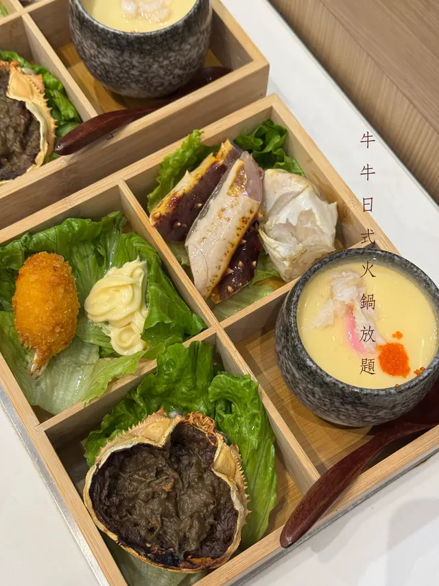 之前黎食過覺得唔錯,趁假期再嚟,點了日式雪場蟹紙火鍋放題最鍾意呢度一人一鍋,8款湯底中揀左傳統山椒味噌、泰。酸辣蝦味道,少少辣鮮味開胃!飲品除咗雪櫃入邊嘅罐裝汽水、茶,sake、紅白酒都有。趁湯底煮滾前,先食套餐隨付既四重蟹盛宴,四宮格裡分別有金黃香脆多蟹肉酥炸蟹鉗、蟹汁鮮甜蛋滑松葉蟹腳茶碗蒸、味噌松葉蟹膏甲羅燒,蟹羔creamy濃郁,爪肥爆肉紅帝王蟹腳,非常吸睛!嚐完蟹宴四品時間啱啱好,可以灼肉食,套餐有多款部位可以點,首選追加澳洲黑安格斯牛肩胛、澳洲M6和牛,薄切夾起唔零碎,肉嫩大片牛油香滑!封門柳肉味濃,牛舌爽口Juicy,牛小排紅潤鮮味,另有草原羶香羊肩,伊比利亞豬挴片,肉味清香,配山椒味噌湯好夾,肉味瞬即提鮮!掃Code可以order海鮮配料,半殼鮑魚好鮮、起膠多餡明太子墨魚滑、青口、肉爽海扇貝、越南鳳尾蝦,放泰式酸辣蝦湯鮮味大放送日式章魚燒波波配燒醬汁一流甜品 有榴槤皇炸彈,仲有自助區嘅糯米糍、生果。真係夠豐富又滿足。…查看更多