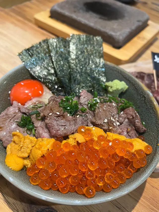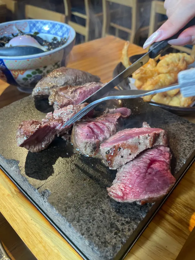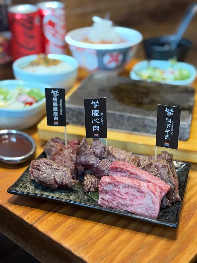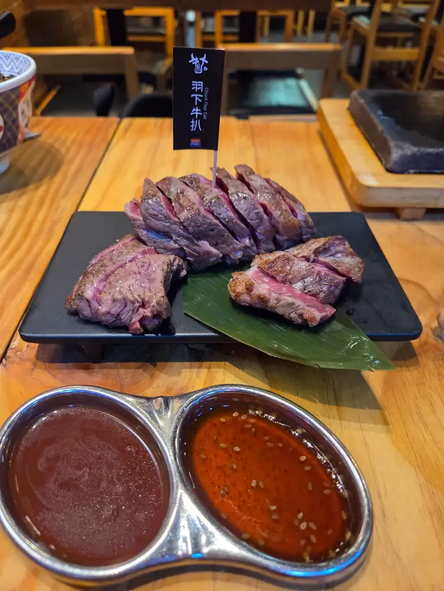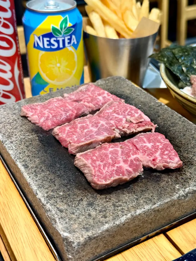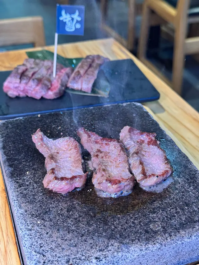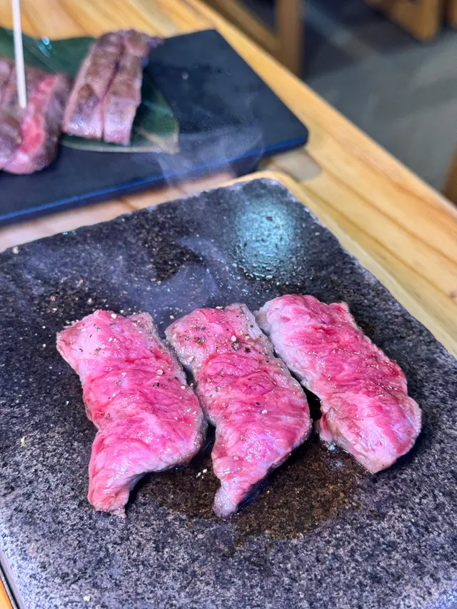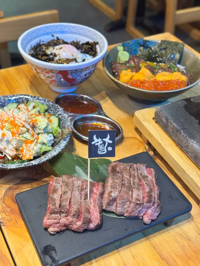 香港首間石燒濕式熟成牛🌟荃灣日糸熱石熟成牛扒🥩牛県🐂📍荃灣享和街49號地下D1號舖今晚同朋友去了這間位於荃灣享和街嘅牛県🐂,主打美國USDA Prime級數濕式熟成牛排,採用濕式熟成牛🥩即是將牛肉真空包裝,以保留牛肉水分,減低重量損耗,在冷藏環境中,讓牛肉本身的酵素進行熟成,以增加嫩度和多汁性,同時減少水分流失,喜歡食牛嘅朋友絕對必試。👅餐廳日式木糸元素環境舒適🎋🎎🎏,營造出放鬆的氛圍,讓人可以慢慢地享受一頓濕式熟成牛排晚餐。牛排放在熱石上燒🪨,熟成度可自由控制,在熱辣辣既熱石上燒得焦香,而內裡軟腍細嫩,鎖緊既肉汁鮮明,入口極富彈性,和市面常見既燒牛排🥩味道,截然不同很喜歡。😋三重燒肉盛合💰抵食$288,絕對是牛扒控必點之選❤️,有共300克既盛合,可以一次過品嚐羽下牛扒、橫隔膜腹肉、腹心肉與和牛四種不同部位,每款口味不同令人回味無窮。加$32轉套餐超划算連飲品、湯、沙律、薯條和飯可以五選三,燒肉配有燒肉汁同自家製紅酒汁🎐。💠羽下牛扒 - 即是牛肩胛骨下方靠近肋骨的部位,油花分布均勻,肉味鮮甜又有油香🌟。💠牛橫隔膜 - 中間部位較珍貴,每頭牛只可以切出一塊HangerSteak。味道濃郁且非常柔嫩,牛味香氣十足,令人難以忘懷💯。💠腹心肉 - 則是意想不到的柔軟,咬下去的瞬間能夠感受到肉汁四溢,讓人欲罷不能👅。💠加送的和牛上蓋肉 - 入口即化搭配簡單海盬,讓肉的自然風味得以充分展現,牛肉愛好者的必試之選❤️。除了濕式熟成牛排選擇外,還有全日供應海膽魚籽燒肉丼🍚都係心水推介。💠海膽魚籽燒肉丼 - 金黃色海膽魚籽色彩豐富,與牛肉的紅潤形成鮮明對比,讓人垂涎欲滴。海膽鮮甜與牛肉丼飯🍚的油香融合,細膩滑順又帶鹹香層次,絕對是必點之選。💠炸九肚魚 - 一定要趁熱食📣,炸得乾身好鬆脆可口,又有九肚魚鮮味送酒一流🍻。…查看更多