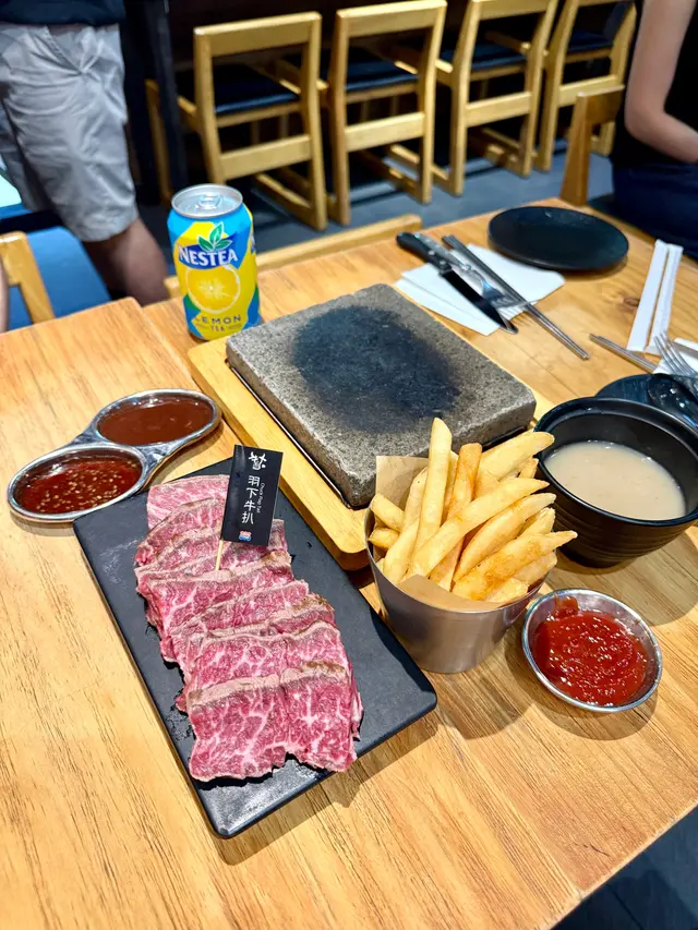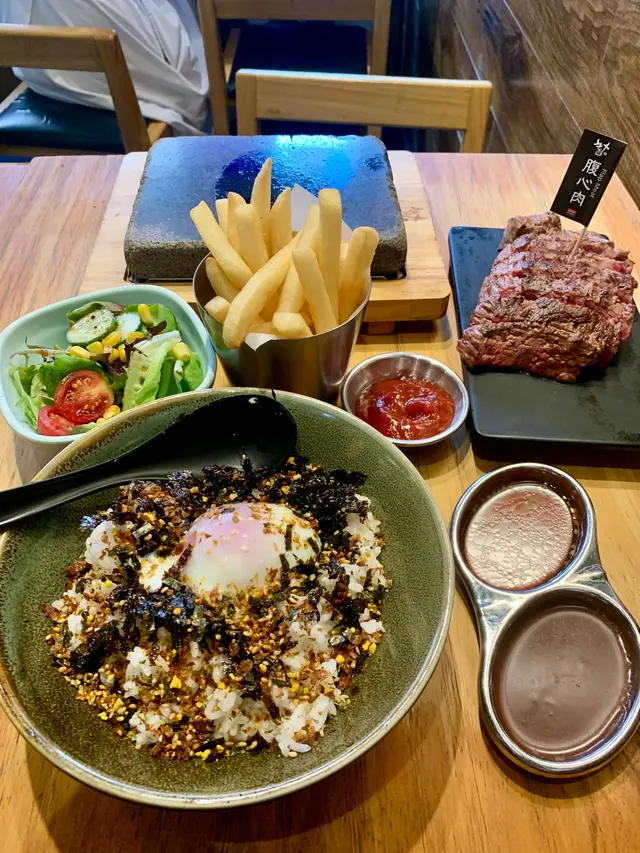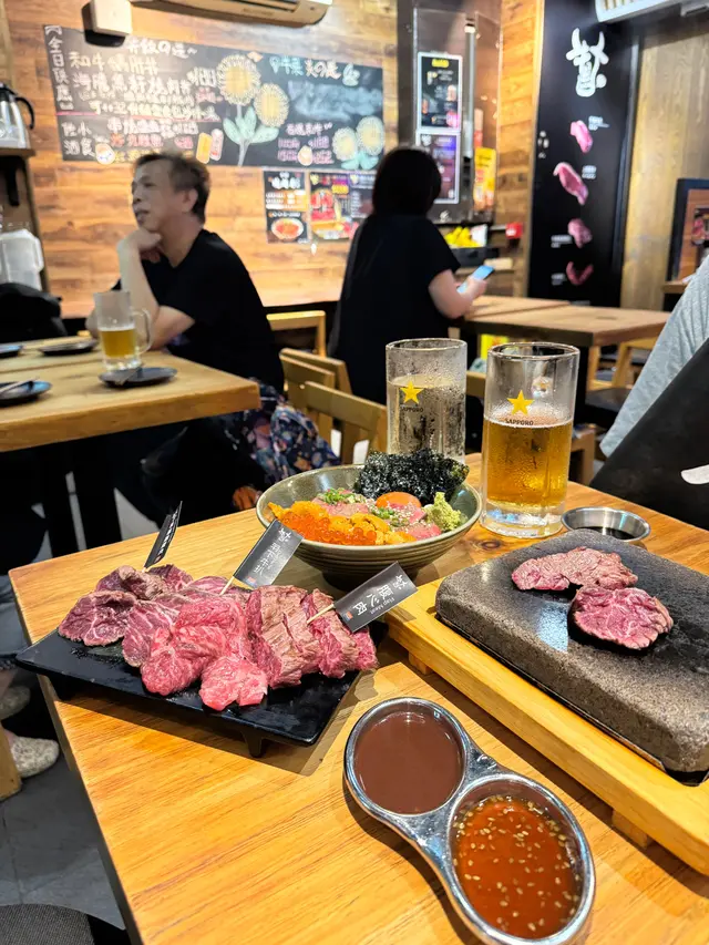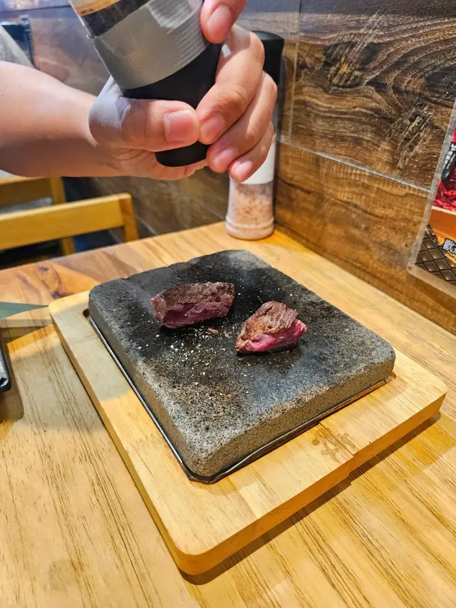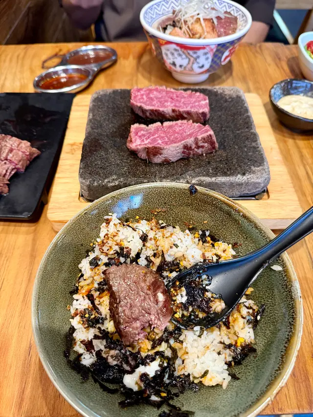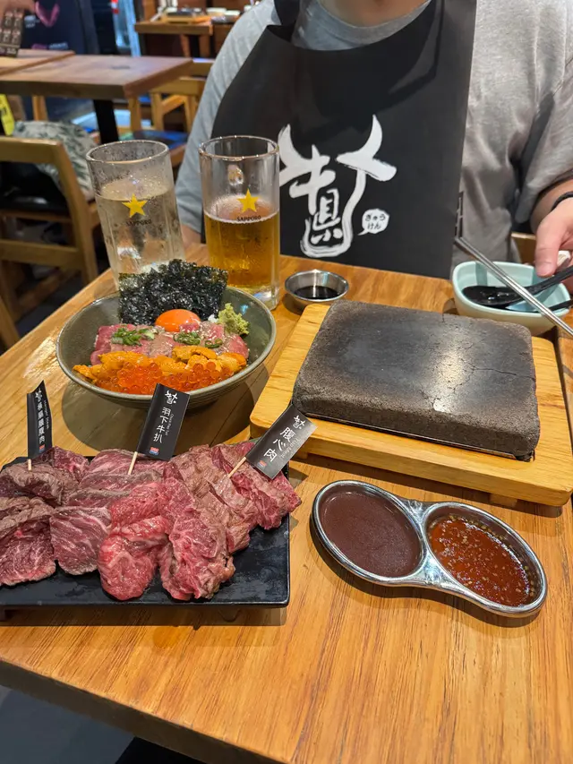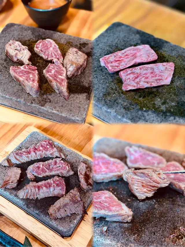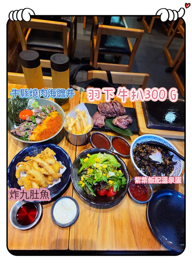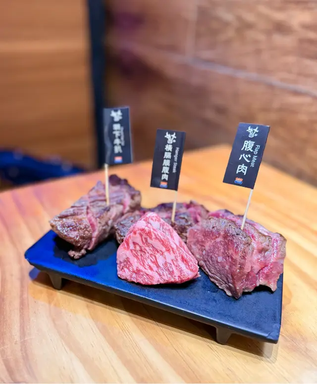 香港首間石燒濕式熟成牛🌟荃灣日糸熱石熟成牛扒🥩牛県🐂📍荃灣享和街49號地下D1號舖今晚同朋友去了這間位於荃灣享和街嘅牛県🐂,主打美國USDA Prime級數濕式熟成牛排,採用濕式熟成牛🥩即是將牛肉真空包裝,以保留牛肉水分,減低重量損耗,在冷藏環境中,讓牛肉本身的酵素進行熟成,以增加嫩度和多汁性,同時減少水分流失,喜歡食牛嘅朋友絕對必試。👅餐廳日式木糸元素環境舒適🎋🎎🎏,營造出放鬆的氛圍,讓人可以慢慢地享受一頓濕式熟成牛排晚餐。牛排放在熱石上燒🪨,熟成度可自由控制,在熱辣辣既熱石上燒得焦香,而內裡軟腍細嫩,鎖緊既肉汁鮮明,入口極富彈性,和市面常見既燒牛排🥩味道,截然不同很喜歡。😋三重燒肉盛合💰抵食$288,絕對是牛扒控必點之選❤️,有共300克既盛合,可以一次過品嚐羽下牛扒、橫隔膜腹肉、腹心肉與和牛四種不同部位,每款口味不同令人回味無窮。加$32轉套餐超划算連飲品、湯、沙律、薯條和飯可以五選三,燒肉配有燒肉汁同自家製紅酒汁🎐。💠羽下牛扒 - 即是牛肩胛骨下方靠近肋骨的部位,油花分布均勻,肉味鮮甜又有油香🌟。💠牛橫隔膜 - 中間部位較珍貴,每頭牛只可以切出一塊HangerSteak。味道濃郁且非常柔嫩,牛味香氣十足,令人難以忘懷💯。💠腹心肉 - 則是意想不到的柔軟,咬下去的瞬間能夠感受到肉汁四溢,讓人欲罷不能👅。💠加送的和牛上蓋肉 - 入口即化搭配簡單海盬,讓肉的自然風味得以充分展現,牛肉愛好者的必試之選❤️。除了濕式熟成牛排選擇外,還有全日供應海膽魚籽燒肉丼🍚都係心水推介。💠海膽魚籽燒肉丼 - 金黃色海膽魚籽色彩豐富,與牛肉的紅潤形成鮮明對比,讓人垂涎欲滴。海膽鮮甜與牛肉丼飯🍚的油香融合,細膩滑順又帶鹹香層次,絕對是必點之選。💠炸九肚魚 - 一定要趁熱食📣,炸得乾身好鬆脆可口,又有九肚魚鮮味送酒一流🍻。…查看更多