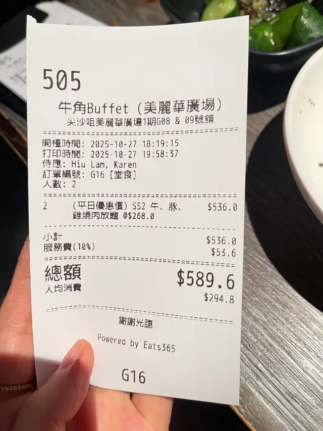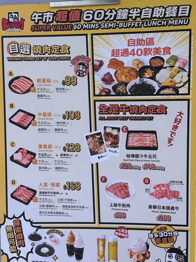 喺門口(check in)已經要揀食邊個餐,睇住個餐牌,揀咗二個$168嘅半自助午餐。份肉就係4+2咁多, 諗住出面都會有啲肉,原來係我「自作多情」,出面有沙律,湯,甜品,炒飯白飯,冷盤,有啲蔬菜菇類同「腸仔」,等等⋯⋯所以如果一心想食燒肉,你就真係要選all u can eat. 呢個半自助就一定滿足唔到你同我。講返啲肉,以為「貴精不貴多」點知真係不敢恭維,又靭又無牛味,唔夠飽唔緊要,出面白飯任裝,而且又有紫菜之類俾你撈飯,咁一定包你飽。既然選擇唔多,整返碗湯試吓~入面啲肉好味過俾你燒果啲,真係意外驚喜⋯⋯咁都有可取之處,可以自制沙律任你撈,同埋午餐時分都無乜人(咁嘅價錢咁嘅食物~梗係啦),可以靜靜的享受午餐,同埋咖啡雪糕任食,不過記住得一小時😂。埋單連九折$330。回頭度:3/10唔係話佢唔扺食,而係啲嘢真係唔好食,真係俾大家食飽個肚,但又唔好有質素同要求?係咪咁?出面任攞嘅預制食物好鹹,飲品之類除咗茶全部都係勁甜,真係挑戰大家個腎臟同肝臟,再講成個場黑孖孖,出面每樣野都有「名牌」寫住係乜,但問題又細又黑點睇?同埋我想講點解唔俾客坐低㨂餐?又唔係大x樂同老麥!以上純粹個人食後分享,絶無收受任何利益同優惠,亦願意承擔所有責任。…查看更多