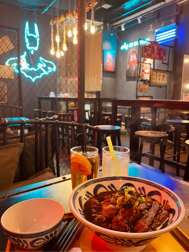 牛霸小麵店位於軒尼詩道球場的後巷仔,平時鮮有人會注意到會有一間餐廳。有點點大隱隱於市。而最近, 餐廳重新裝修轉了風格,加左好多霓虹燈,有點點酒吧的感覺, 打破沉悶的台灣小店,以美國DC漫畫和電影為主題,小丑和小丑女, 歐美漫畫掛畫及工業化的裝飾,絕對是打卡影相地方。 紅燒牛肉麵 $65湯底藥材味香濃,不鹹,易入口。湯底帶有點點蘿蔔味,雖然牛肉切條大大條,但都做到入口即溶,不過都好入味,一點牛騷味也沒。手工拉麵底,口感似拉麵,腍身且滑溜。蕃茄牛肉麵 $68同樣的都是出色的牛牛, 蕃茄非常香濃。可以成碗飲晒,連飲料都不用要。夜市拼盤 $48有齊鹽酥雞,台灣腸,花枝丸,炸豆腐同炸墨魚丸, 選擇困難症也不怕呢~炸粉不厚,椒鹽味OK,食落好飽滿。款款都好食,即叫即整。柚子雞翼 $35柚子醬幾甜~雞翼比較大隻~雞有雞味!珍珠奶茶不太甜,珍珠好彈牙洛神花茶聞起來都覺得很香~查看更多