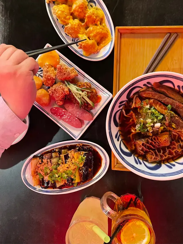安樂里有條隱世小食街,有一個小公園遮住,真的要識食先搵到。餐廳空間寬闊,深色系為主,牆上面掛不少電影為題的海報和霓虹燈。牛三寶牛肉麵($70)牛三寶即是牛腩,牛肚,牛展,三款味道都不錯,滷水味不會太過濃烈,可以吃到食材本來的味道和口感,特別推介牛展,有點像牛根腩但少了點油膩感。湯底主要是牛味帶有點點藥材味,比較清澈少了點油膩感👍🏻台灣夜市拼盤($48)有花枝,鹽酥雞,台灣香腸,炸豆腐。人少少可以每樣吃一點,十分方便。火爆芝士鹽酥雞($36)原來是鹽酥雞上加上車打芝士製作而成😆,令我吃了不少鹽酥雞。秘製小茄子🍆($35)肉鬆蔥花灑上小矮瓜上,加上秘製醬汁。醬汁帶點鹹甜的味道,有丁點兒嘅酸味,十分配襯小矮瓜。🍹冬瓜檸檬🍋($24)荔枝玉露($24)跟餐一杯半價~總括而言,價錢都算幾經濟。而且有適合2人的小食,可以不用吃得太多同款小食。特別推介牛三寶牛肉麵!查看更多