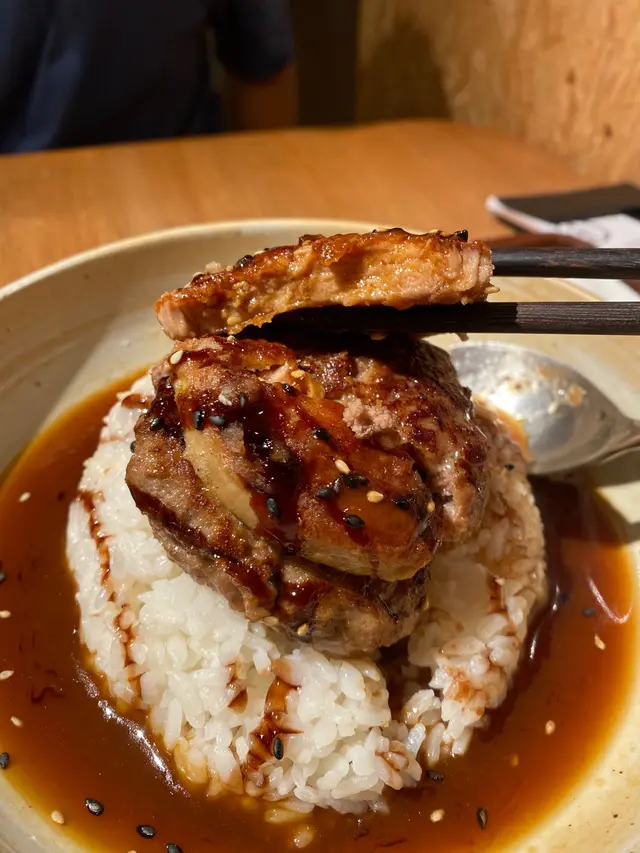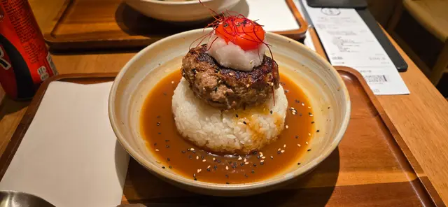 小店裝潢簡約, 冷氣充足, 唯電訊網絡接收差。All day menu 選擇不少, 首次光顧選了其限量供應的招牌手打和牛漢堡蘭王蛋飯。1) 招牌手打和牛漢堡蘭王蛋飯 $128 (配日式咖喱汁和日式泡菜)2) 雞皮餃子 (2件) $183) 蜂蜜綠茶 (凍) $5招牌手打和牛漢堡蘭王蛋飯可自選醬汁和配料, 我選了日式咖喱汁和日式泡菜。丼飯由飯作基底, 以層層疊的方式堆砌漢堡, 日式泡菜和蘭王蛋, 賣相吸睛。嚐一口咖喱汁, 咖喱香辣惹味, 質感濃稠, 雖然要求了多汁, 還是覺得不夠。飯的份量不少, 甚有黏性。和牛漢堡牛味濃郁, 既鬆軟又juicy, 可口美味。日式泡菜配上蘿蔔蓉和蘭王蛋汁同吃, 層次豐富。追加了雞皮餃子, 雞皮餃子煎炸得香口, 外表微脆有彈性, 肉質juicy。蜂蜜綠茶味道不俗, 入口透心涼。由於選了招牌手打和牛漢堡蘭王蛋飯 (霸王餐), 吃畢碗底會有驚喜, 有機會贏得免費飲品 / 小食 / 半價優惠 / $40現金券 / $1漢堡扒 / $1小食。雖然最後獲得 $40 現金券 ($8 x 5張), 但要消費每滿$88才可使用一張, 運氣實屬一般。…查看更多