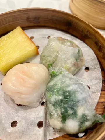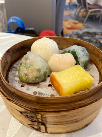 五式點心拼盆極力推介,有五粒唔同點心,包括蝦餃,粉果,鮮蝦豆苗餃,雞包仔和黃金糕,同樣熱辣辣,CP值高。