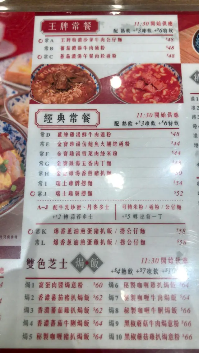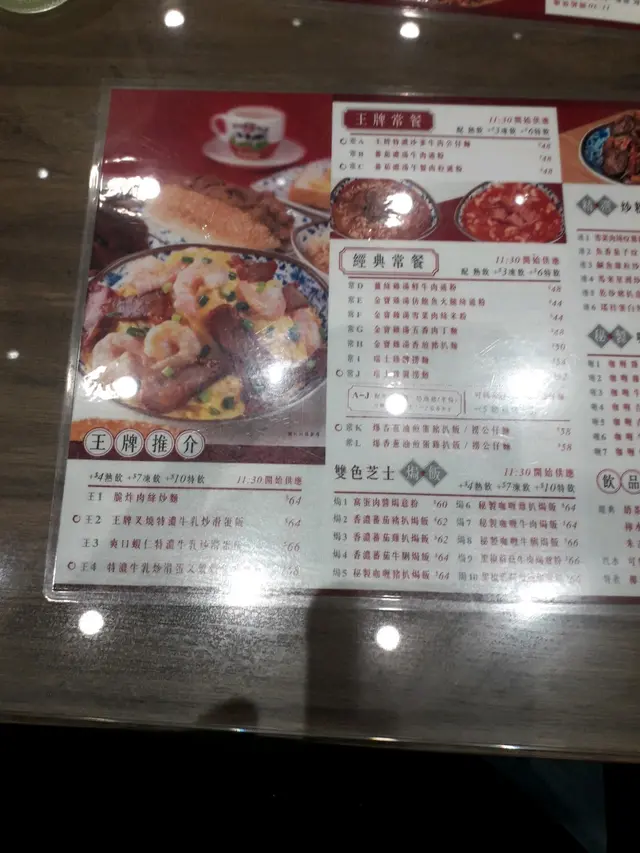 今日去完旺角配眼鏡,帶住小朋友想搵間餐廳食個tea。 行過見到依間王牌冰室,睇落都幾乾淨,座位空間都夠寬敞,行到入去揀咗個卡位坐。茶餐選擇都幾多,但係都係常餐吸引咗我。常餐11點後全日供應⏰蕃茄濃湯牛肉通粉配丹麥多士同炒蛋 $48跟熱飲凍飲+$3,特飲+ $6。個🍅蕃茄湯底🍲真係好蕃茄,夠晒濃郁,正。丹麥多士🍞搽咗牛油喺面,可惜唔係好夠熱同酥脆。個炒蛋幾好味😋🥚推介🌟🌟🌟🌟之後仲嗌咗個茶餐☕️炸雞髀拼西多士半份🍗$42加炸髀好夠味揸得亦都非常酥脆好正,肉好Juice,半個西多士比我想像中大份,好厚身,搽咗好多花生醬喺入面,同埋糖漿喺面,好味👍🏻👍🏻推介🌟🌟🌟🌟 🌟我哋一大兩細食到超飽,份量好足夠👍🏻職員都好有禮貌,可惜只收現金🙈,差啲冇錢俾😂😂😂查看更多