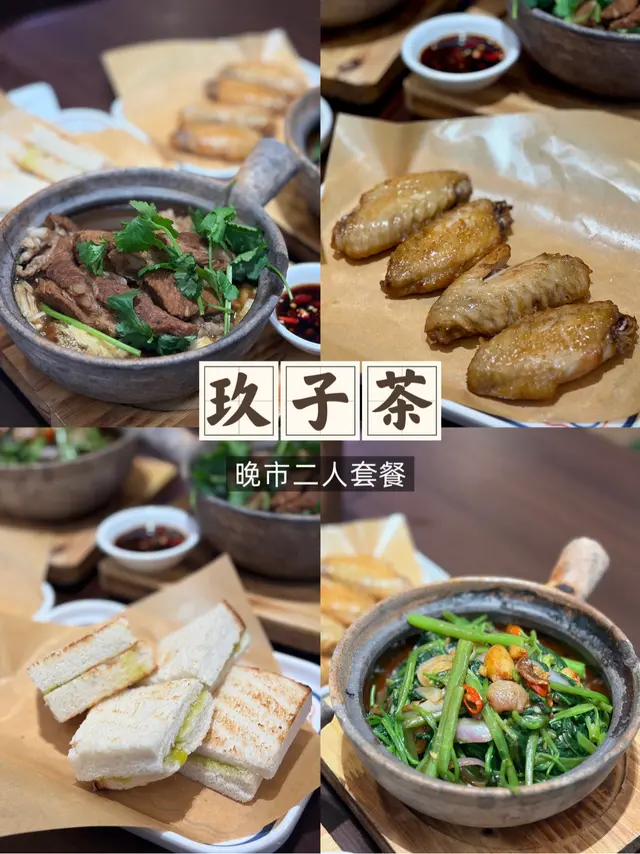 🥘將軍澳晚飯|玖子茶雙人晚市套餐 主食小食飲品一次過試齊😍🌿砂煲肉骨茶 熱辣辣上枱,茶香滲入湯底,配上足料沙底排骨勁入味,入口清而不寡,暖胃又帶少少藥膳風味。🥬馬拉盞炒時令菜 鑊氣足,馬拉盞鹹香惹味,將時令蔬菜嘅爽脆同鮮甜都吊出嚟,送飯一流。🍞斑斕咖映多士 斑斕香配咖啡味,多士烘到外脆內軟,甜香中帶住少少大人味,當飯後小甜品好啱。🍗燒雞翼表面燒至金黃,皮微脆、肉嫩多汁,一人兩隻啱啱好,邊飲茶邊啜翼極chill。☕美綠(熱)|🍋檸檬蜜(熱) …查看更多