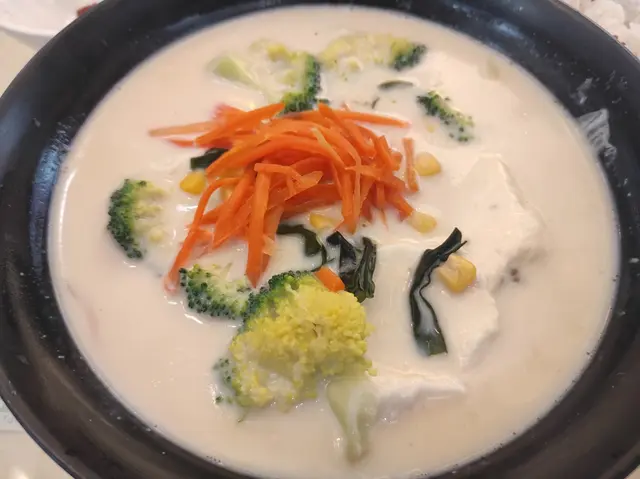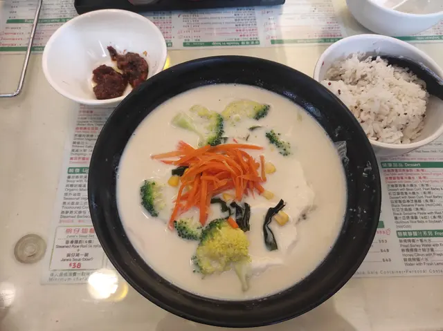 首次來臨,老闆精心推介這個西蘭花豆腐豆漿湯飯給我吃。建議: 喜歡吃清淡丶無添加丶自然食物的朋友可試試特色: 1.豆漿湯很香濃,很新鮮據說是用機親手打磨的2.配合自家製的面豉醬,咸咸的豆香味為鮮香的豆腐加上點兒味道3裡面有塊豆腐很特別,裡面有一顆顆的東西,原來是健康的奇亞杍,挺有創意4.配合健康紅米飯老闆是個懂享受丶願意分享品嚐心得和研究的人,服務態度也很好。查看更多
