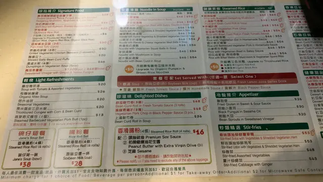 珍心又係一間我好鐘意去既平民素食店,一黎平啦,二黎依度仲有好多香港地道小食。每次黎到都唔知食小食定係正餐好,而最後通常都係會揀左小食。碗仔翅餐包左珍心素碗仔翅同香滑腸粉。珍心素碗仔翅既英文名係Jane's Soup,唔知老闆英文名會唔會就係Jane呢。碗仔翅都幾多料,有木耳、冬菇、豆干同粉絲,味道同濃度同一般碗仔翅都差唔多,加埋醋同胡椒粉就perfrect。香滑腸粉真係好香滑,加埋自家製麻醬同靚豉油,成個味道昇華左。順帶一提佢地既辣醬都幾辣下,唔食得辣既朋友唔好咁貪心,一次過落勁多。猴頭菇飯可以揀唔同汁,我地就揀左燒汁。啲猴頭菇口感唔錯,個燒汁既鹹甜亦都適中,份量又夠哂多,無可挑剔。最後介紹埋我最愛既手包粢飯。粢飯可以揀普通糯米或者三色米,三色米健康啲,但唔健康既食物永遠比較吸引。熱辣辣既糯米包住仲係脆卜卜既油炸鬼同素肉鬆,平凡但好味。食得太飽,已經冇空間再食埋甜品。如果食甜品既話,一定要食冰糖腐竹糖水,味道清甜,啲腐竹好足料又夠滑,真心正。查看更多