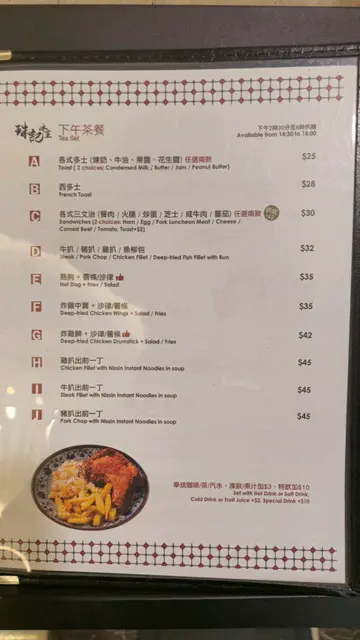 這間茶餐廳,談不上驚艷,卻是我們一家四口的日常飯堂。女兒趕補習前,常來點一份早餐,腿蛋治•熱華田,三十蚊,五分鐘上桌,熱氣騰騰。我最愛他們的熱奶茶,茶膽濃澀而不澀喉,倒入淡奶的瞬間漾出琥珀色漩渦。這裏的餐牌二十年如一日,凍飲加三蚊。膠餐牌反而比那些電子餐牌更有溫度。或許茶餐廳從來不只是吃飯的地方。那個總記得我走甜的阿姐,當連鎖餐廳越開越多,這種街坊味道顯得愈發珍貴。我們在這裏吃的不只是食物,更是歲月醞釀的安心與熟悉。